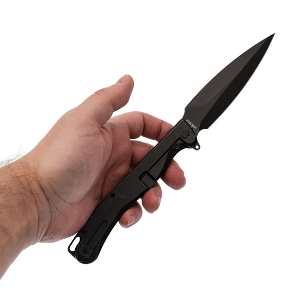 Клинок выполнен из порошковой стали CPM-S90V – одного из самых износостойких и коррозионно-стойких сплавов на рынке. Его Spear-Point профиль обеспечивает тонкий, деликатный кончик, удобный для точных надрезов и проколов. Покрытие Black Stonewash не только улучшает защиту от коррозии, но и маскирует следы использования.