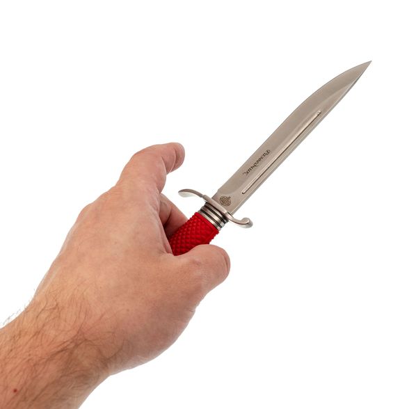 Рукоять "Разведчика" оснащена всадным монтажом и развитым упором для защиты руки. Она изготовлена из эластомера, который обладает высокой износостойкостью и цепкой текстурой, что предотвращает скольжение. Благодаря этому нож удобно лежит в руке и не требует особых усилий при работе.