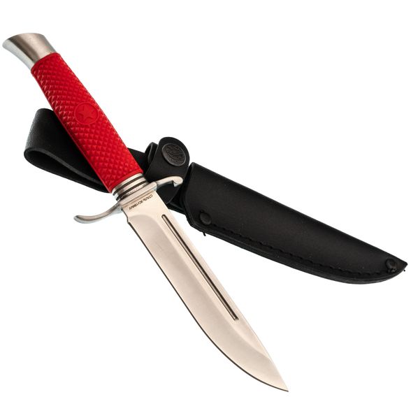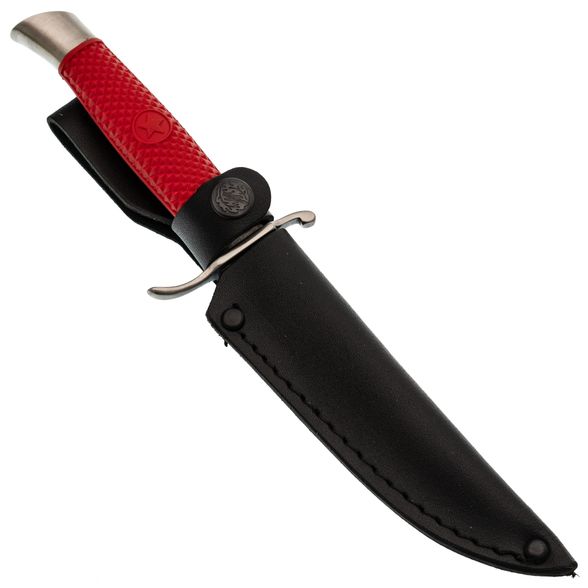 Кожаные ножны с хлястиком надёжно фиксируют нож и обеспечивают безопасное ношение. Жёсткий подвес позволяет легко носить его на поясе и быстро извлекать при необходимости, обеспечивая оперативный доступ в любой ситуации.