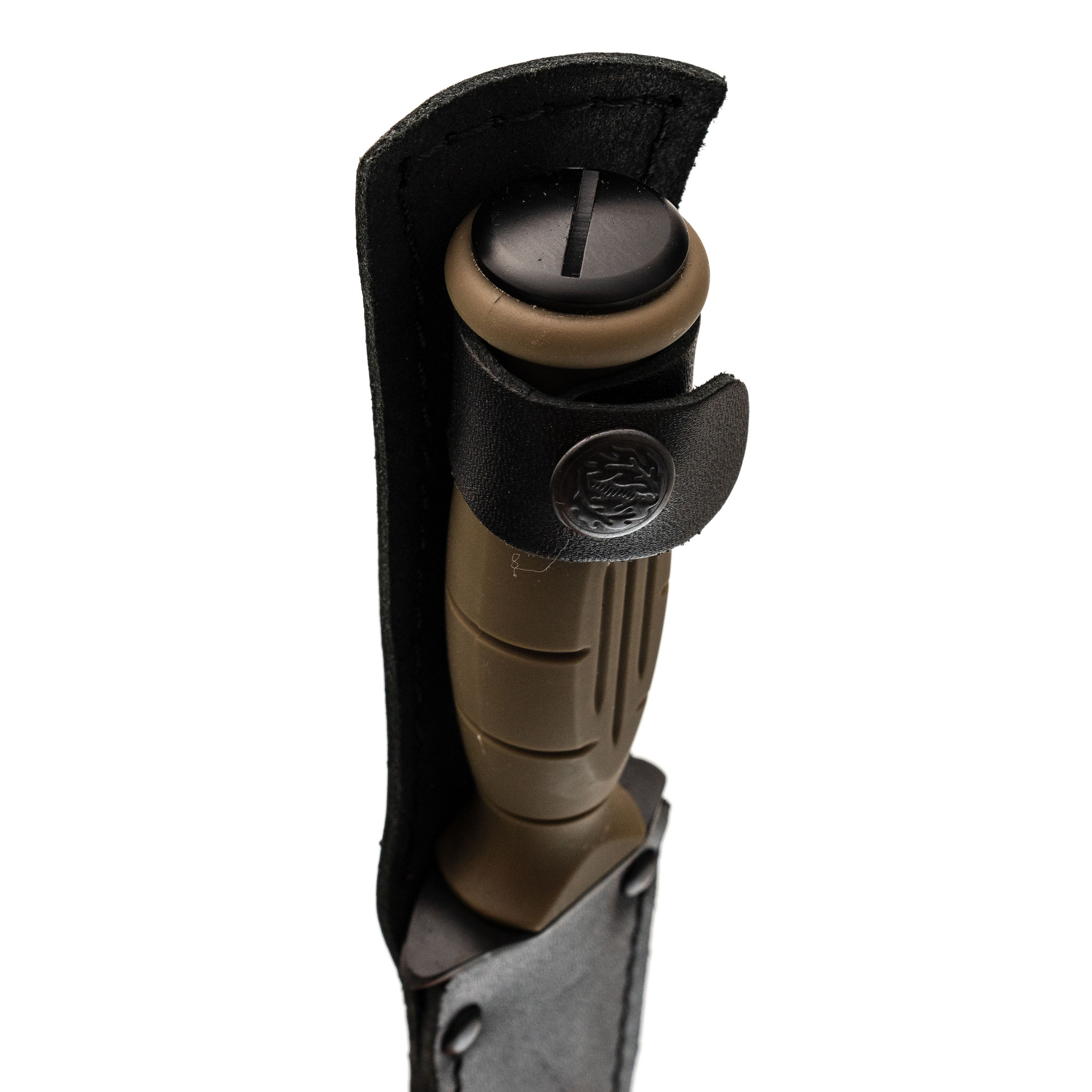 Ножны из натуральной кожи надежно фиксируют нож и обеспечивают удобное ношение на ремне. Жесткий подвес и дополнительный хлястик обеспечивают безопасное ношение ножа, исключая его случайное выпадение.