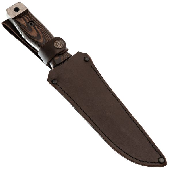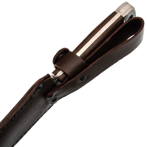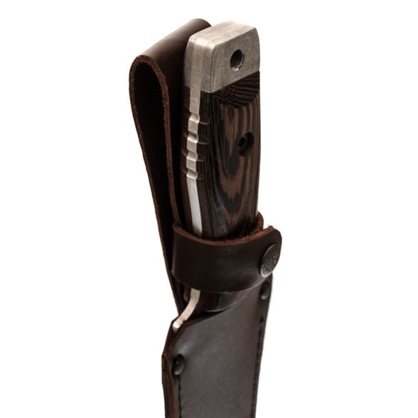 Качественная натуральная кожа с жёстким подвесом. Ножны держат форму в рюкзаке, надёжно фиксируют изделие и позволяют извлекать его без лишних усилий.