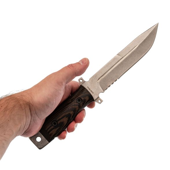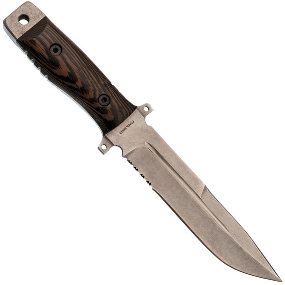 Форма Drop-Point с вогнутыми спусками обеспечивает глубокий рез и точное ведение по материалу. Увеличенная толщина и длина позволяют и строгать, и уверенно рубить мелкие сучья; клинок создан, чтобы выдерживать боковые нагрузки. На основной кромке - частичный серрейтор для быстрой работы по синтетике и грубой коре; оставшаяся прямая часть отвечает за аккуратный рез.