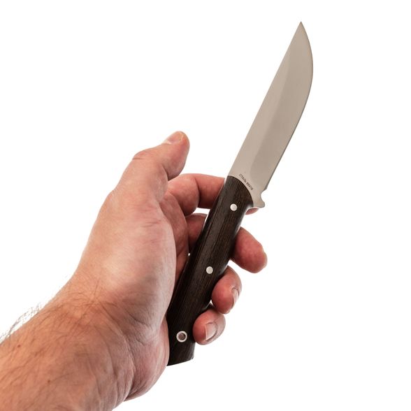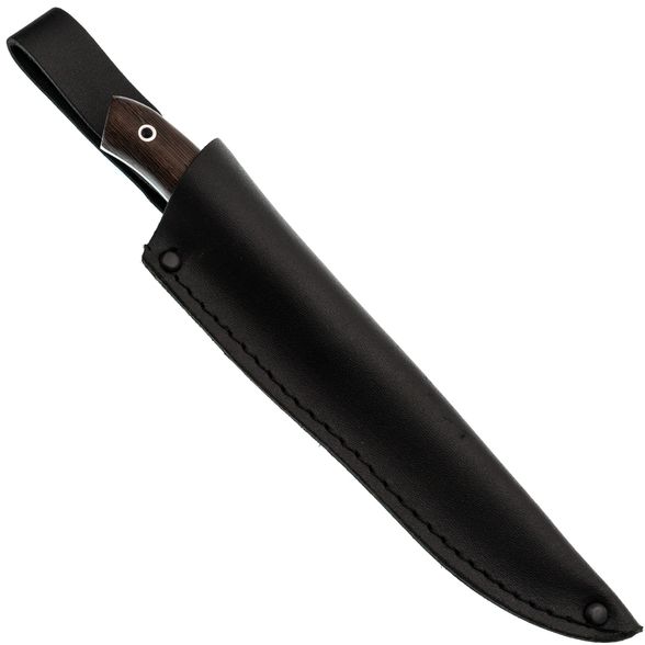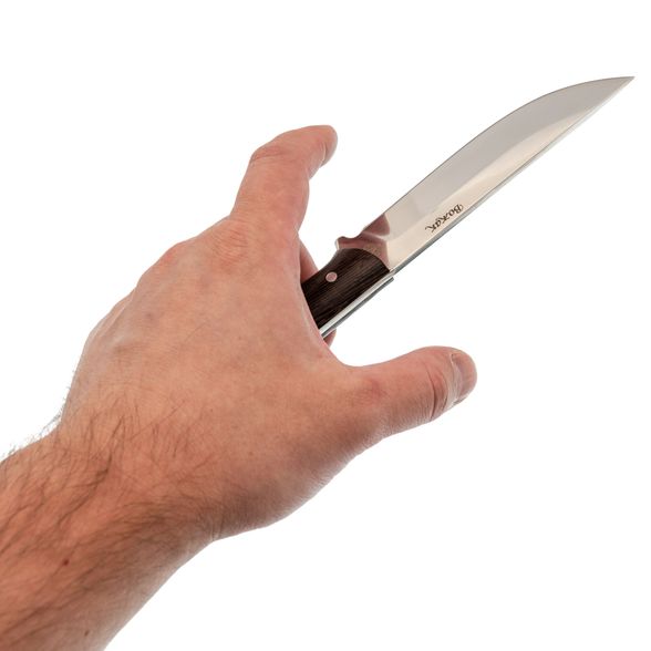 Рукоять из венге надежно заполняет руку, создавая комфорт даже при длительном использовании ножа. Ее текстура предотвращает скольжение, что делает инструмент безопасным и удобным. С таким ножом можно работать продолжительное время, не чувствуя усталости и неудобства.