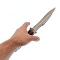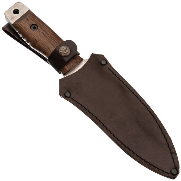 Универсальный Drop-Point с вогнутыми спусками. Толстая и длинная геометрия уверенно рубит тонкие сучья и стабильно строгает, сохраняя жёсткость при боковых нагрузках. На обухе - серрейторная заточка; на режущей кромке - умеренная рекурва, помогающая "подтягивать" материал и углублять рез.
