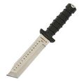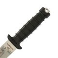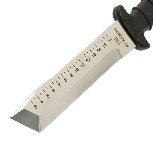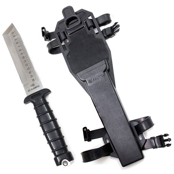 НОЖ ВОДОЛАЗНЫЙ НВ, СТАЛЬ 95Х18, РУКОЯТЬ ТЕРМОЭЛАСТОПЛАСТ, ПЛАСТИКОВЫЕ НОЖНЫ используется в подразделениях ВМФ РФ в качестве одного из элементов снаряжения для подводных пловцов. Нож полностью учитывает возможность работы практически в любой ситуации: в полной темноте, на сильном течении или в соленой воде. Рукоять ножа имеет бочкообразную форму и несколько поперечных упоров, что обеспечивает уверенное удержание и точную работу. Геометрия клинка позволяет использовать эту модель в качестве стамески, ломика или серрейтора для разрезания синтетических сетей и тросов. На левую голомень нанесена сантиметровая разметка, которая позволяет определять размеры предметов под водой. Для крепления ножа к телу или элементам снаряжения используется пластиковый чехол с двумя ремнями и петлей фиксатором для рукояти. В нижней части чехла расположено сливное отверстие для воды.