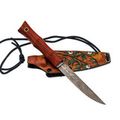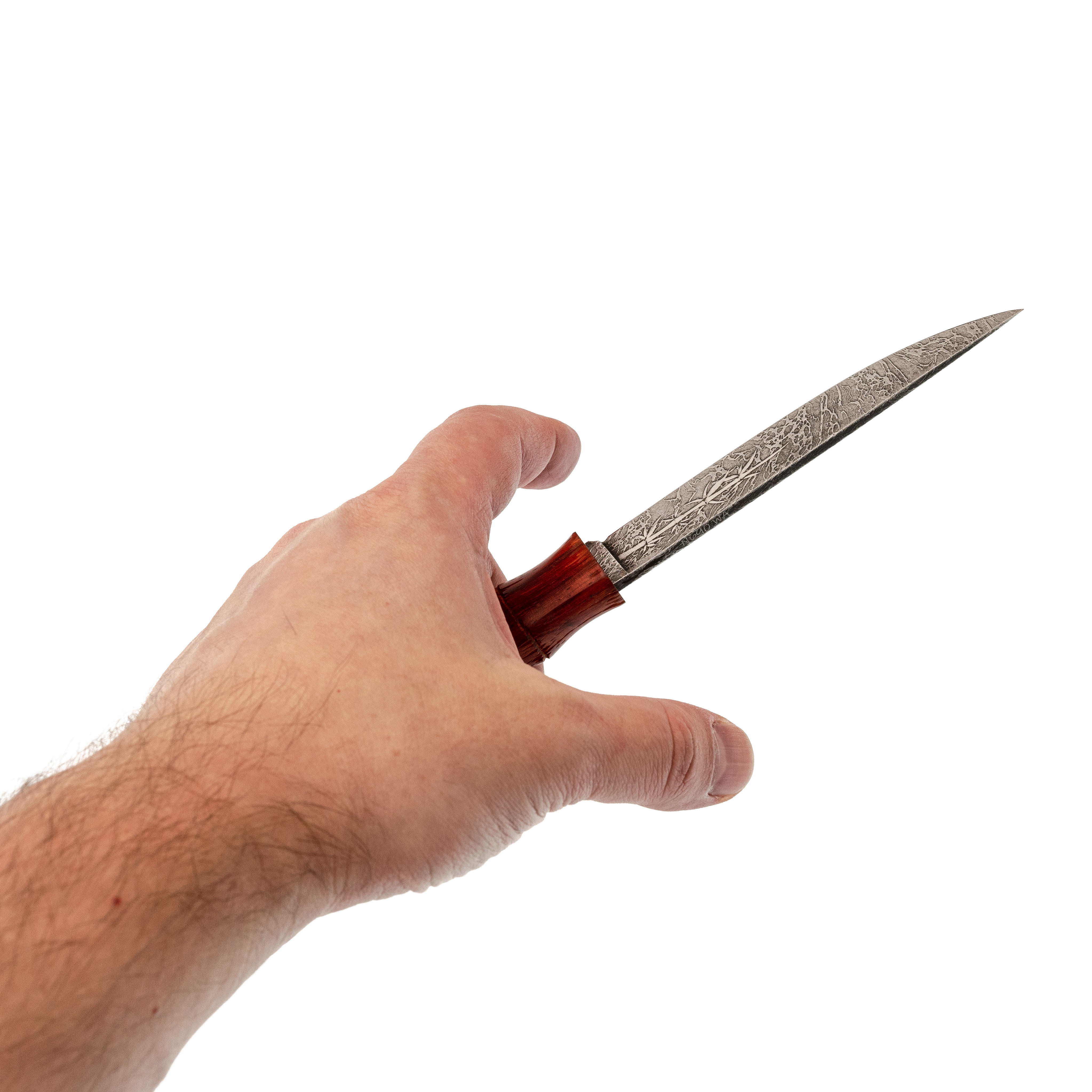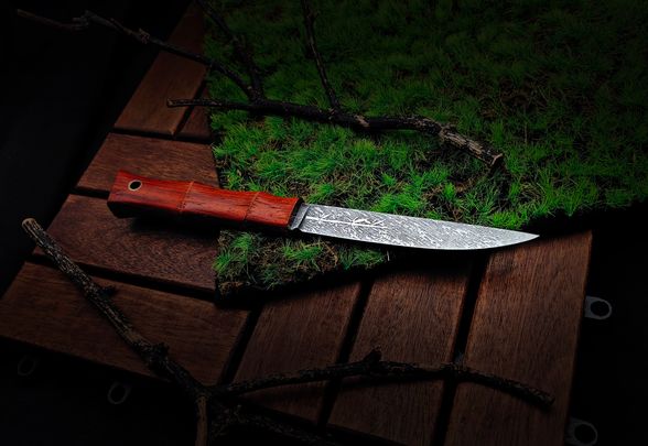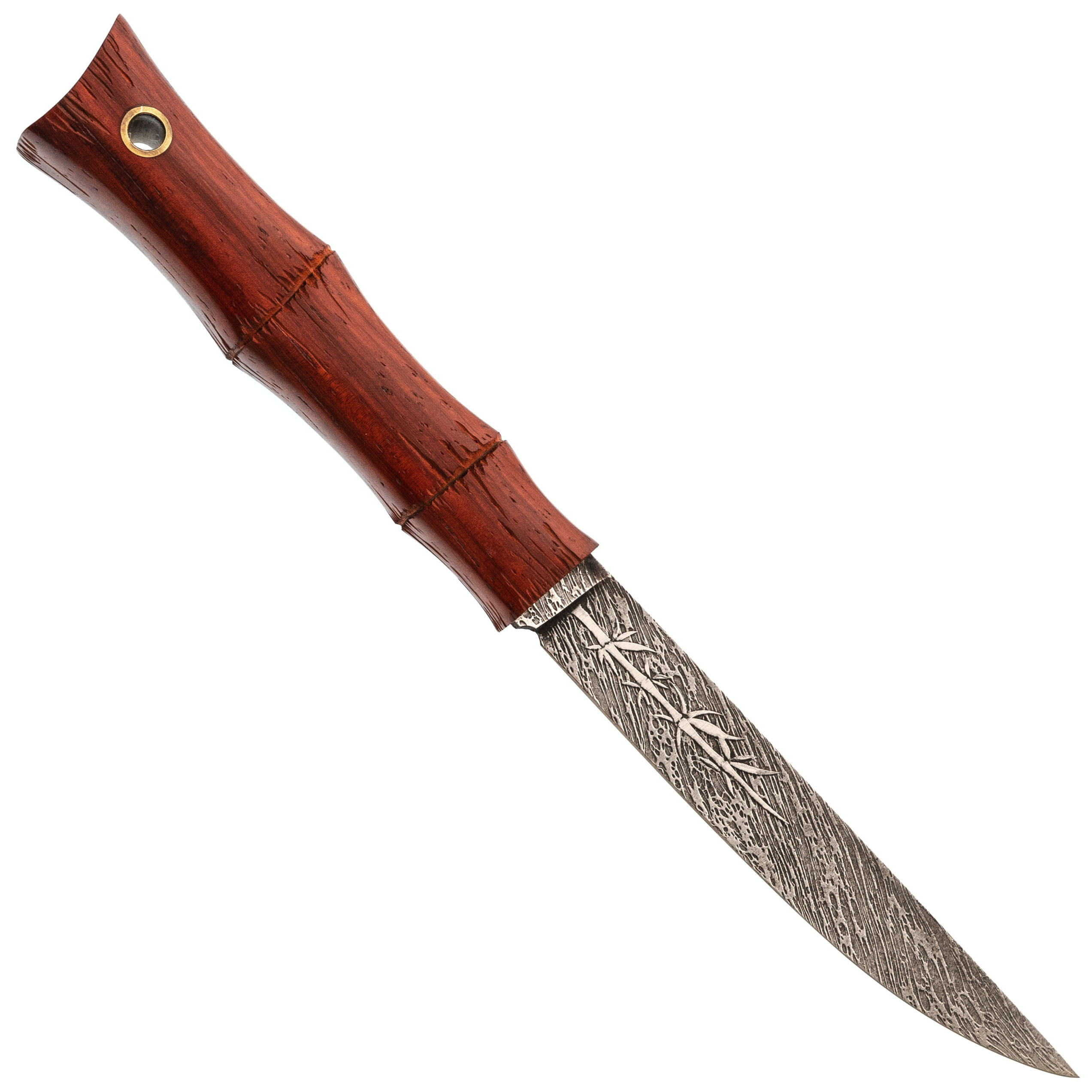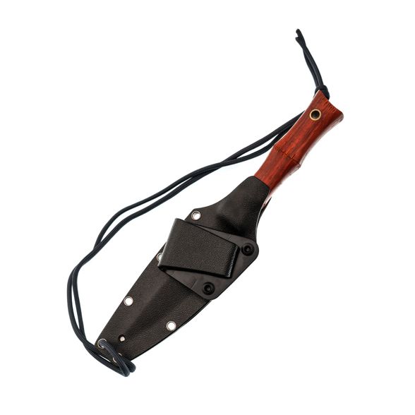 Рукоять из падука выполнена в виде сегментов, напоминающих натуральный бамбук. За счёт плавных перетяжек ладонь автоматически находит удобную опору, нож не стремится провернуться и надёжно сидит в руке в разных хватах. Тёплое на ощупь дерево приятно контрастирует с холодом клинка, а лёгкие следы эксплуатации и ручной обработки придают изделию характер и подчёркивают работу мастера, а не конвейера.