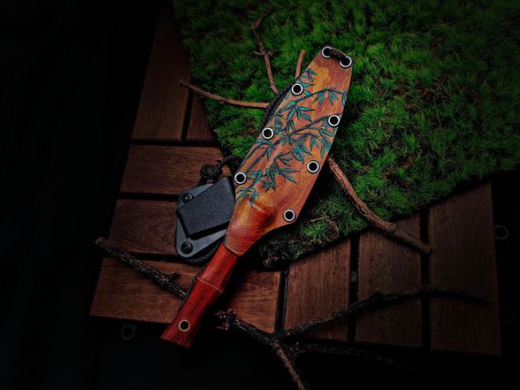 Нож Бамбук от мастерской "Волчий Век" - лёгкий рабочий фикс средних размеров, в котором соединились функциональность и спокойная природная эстетика. Форма клинка, рукоять и ножны объединены темой бамбука: рельефная деревянная рукоять напоминает стебель, художественная гравировка продолжает мотив, а ножны с ручной окраской собирают образ в единое целое. По габаритам и поведению в работе Бамбук уверенно чувствует себя и на туристической стоянке, и на домашней кухне: длины клинка хватает для серьёзных задач, при этом нож остаётся удивительно лёгким и не утомляет руку. Это тот случай, когда один универсальный помощник закрывает сразу несколько ролей в походе и дома.