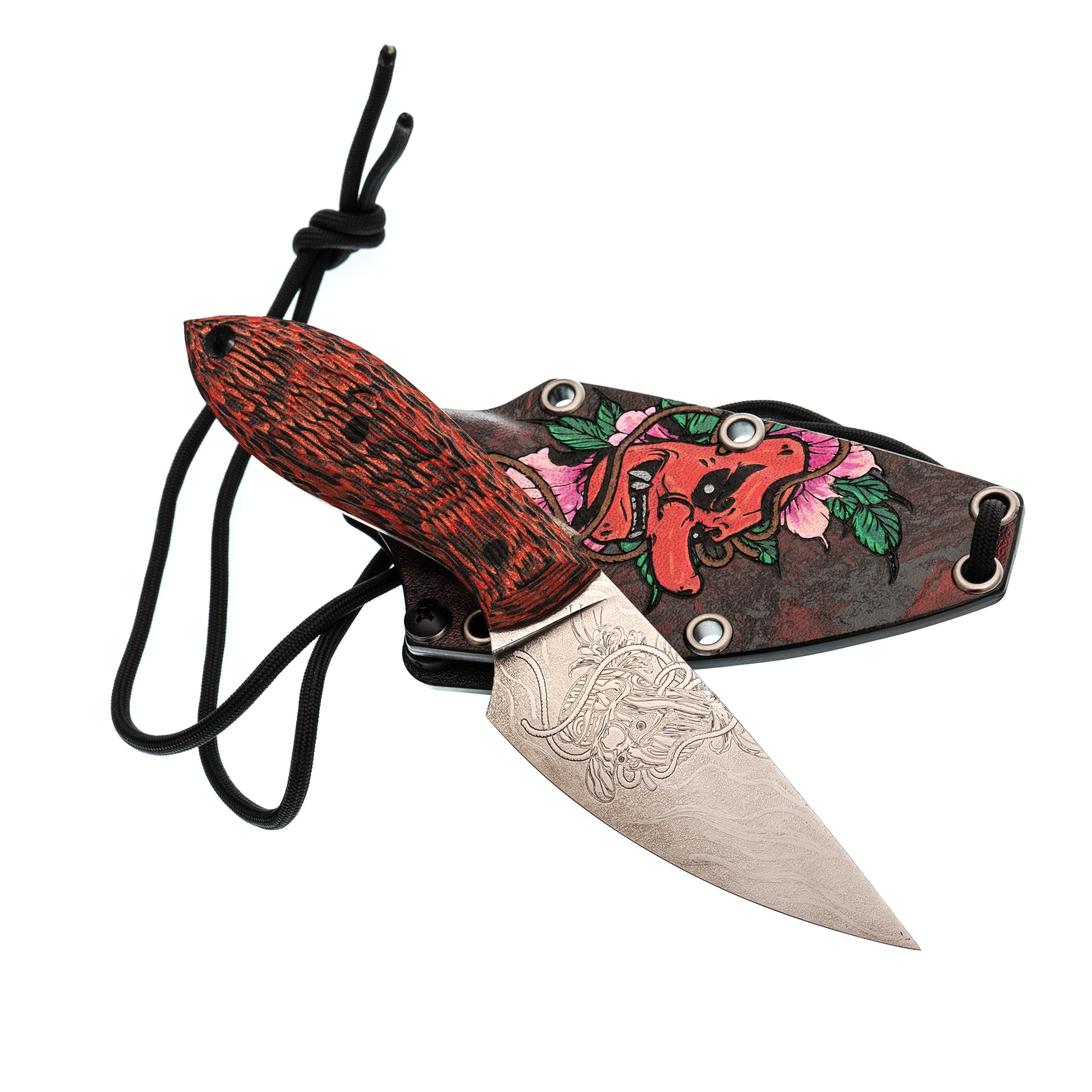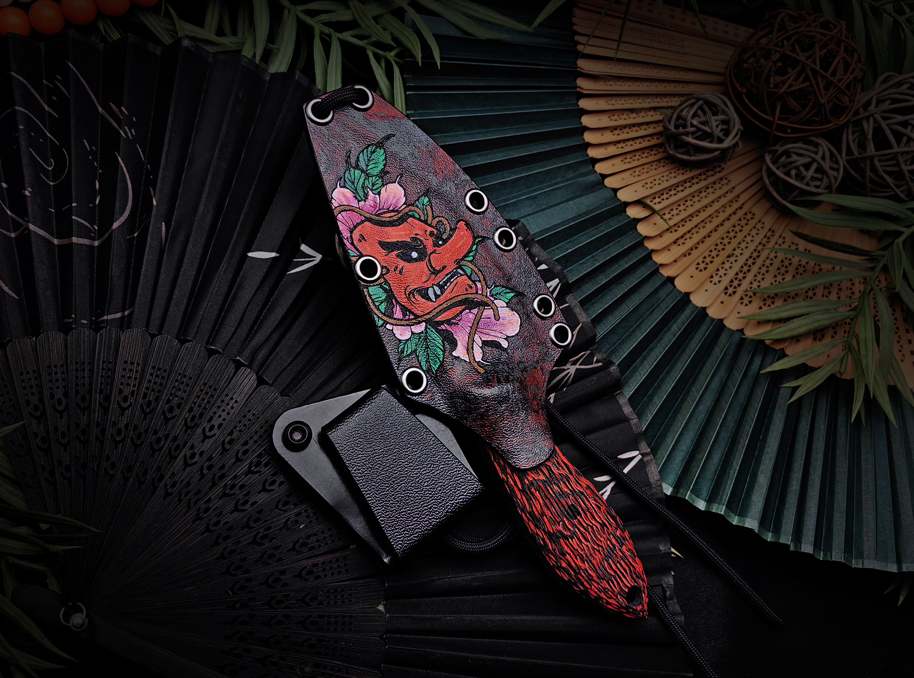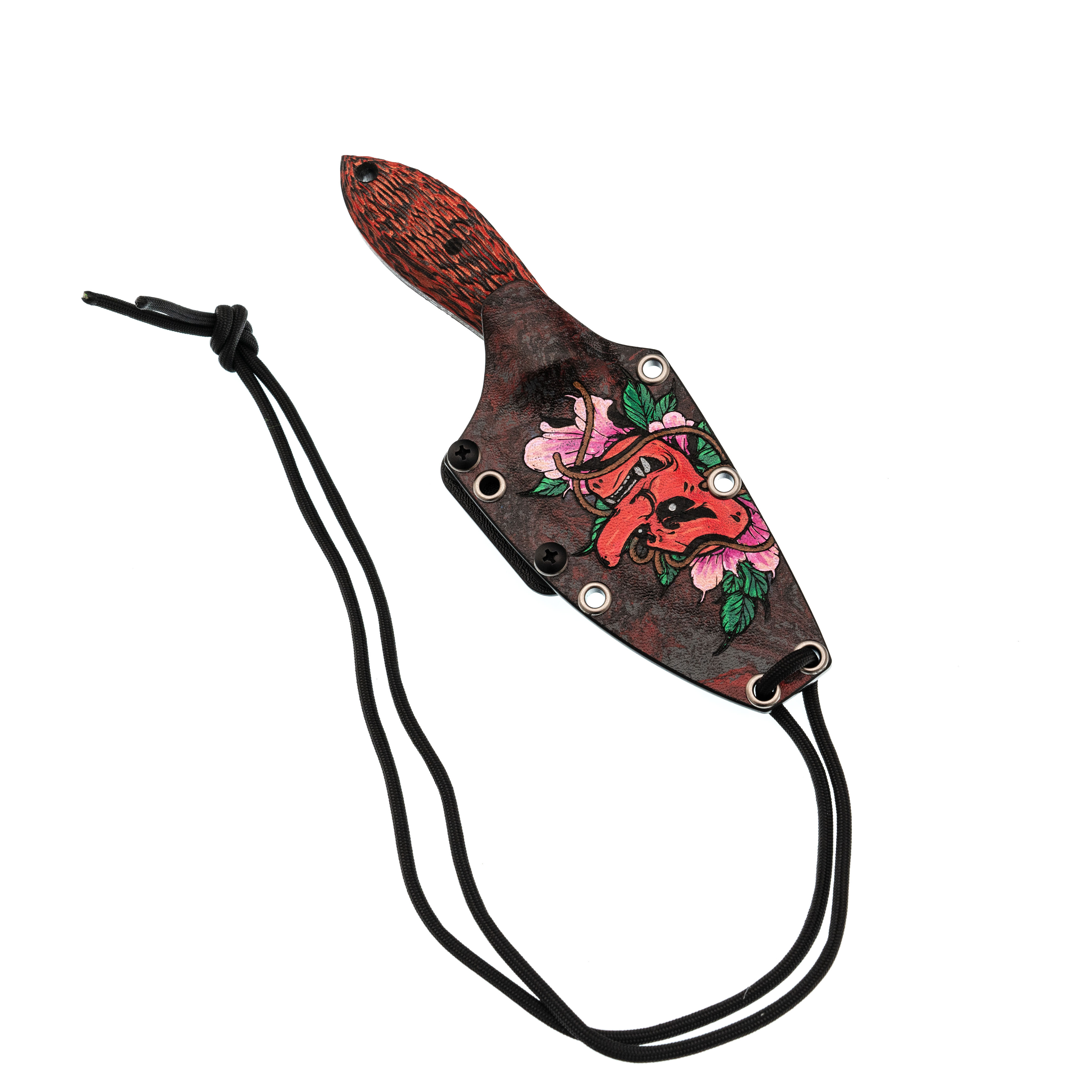 Ножны из Kydex подогнаны под клинок с хорошим усилием: нож фиксируется с характерным щелчком и не болтается внутри. В комплект входят шнур из паракорда для ношения на шее и клипса для крепления на ремень - каждый выбирает вариант под свой образ жизни. Яркая ручная роспись с мотивом Они выделяет Масичьку среди других ножей на подвесе или в ящике и делает его узнаваемым спутником на каждый день.