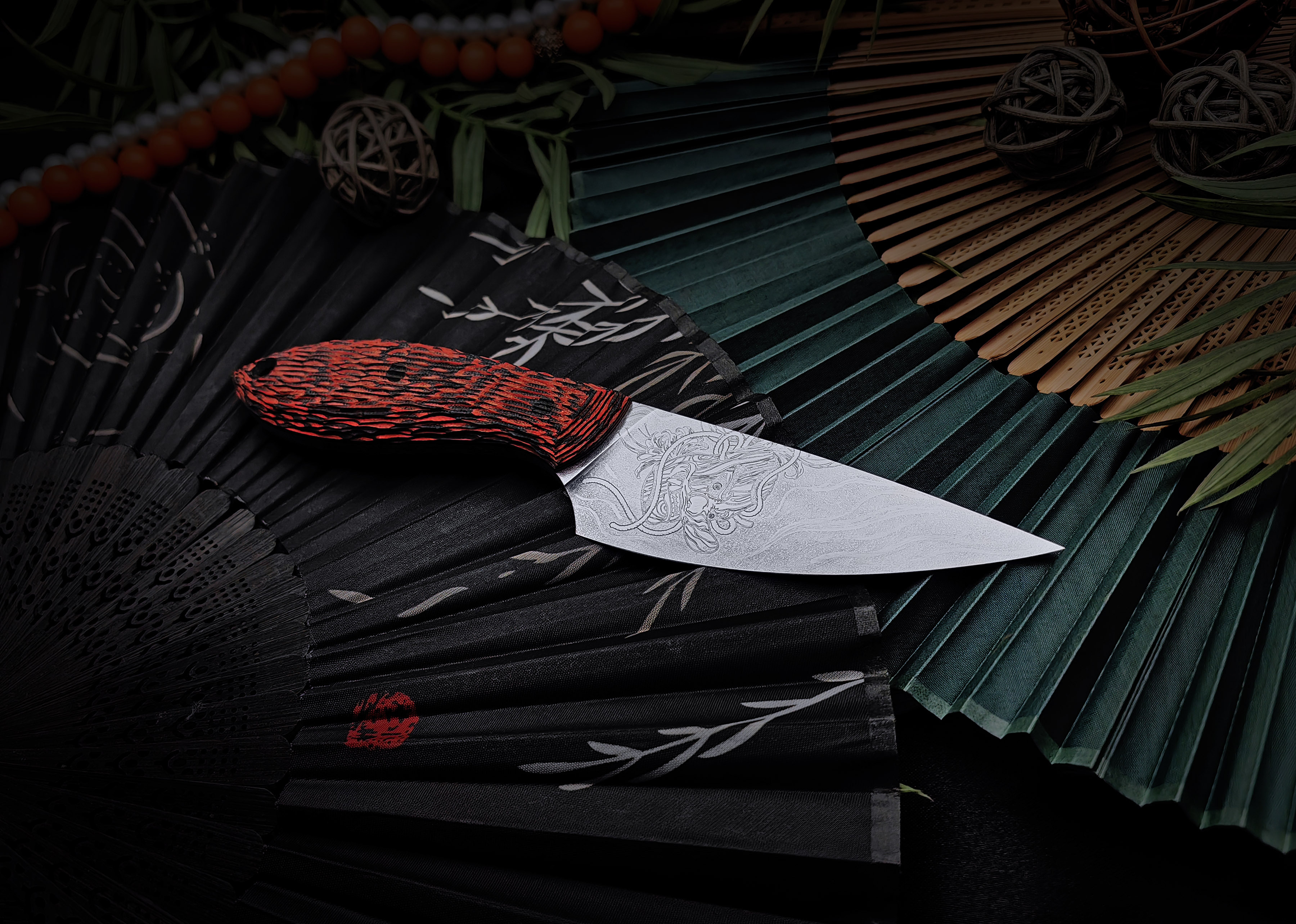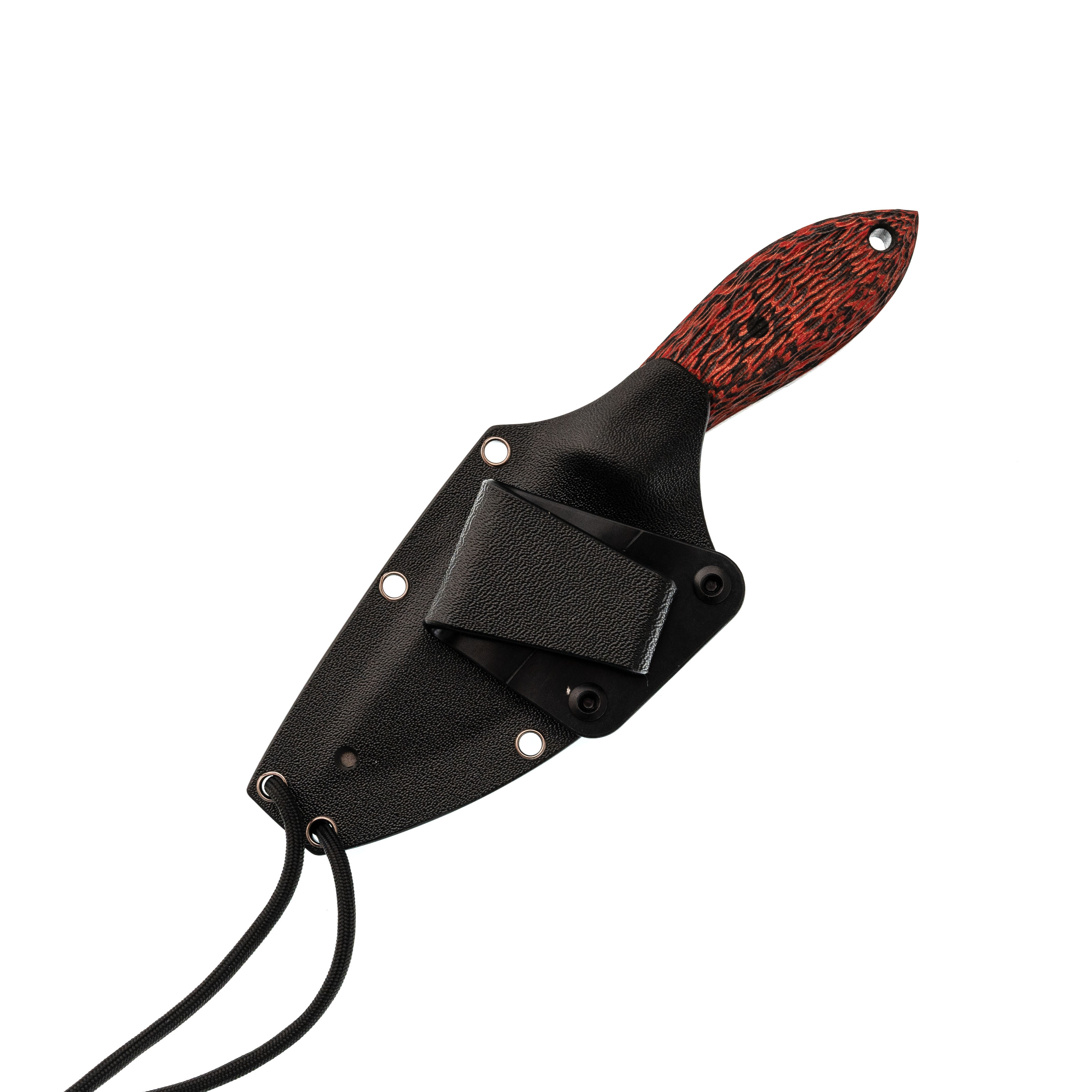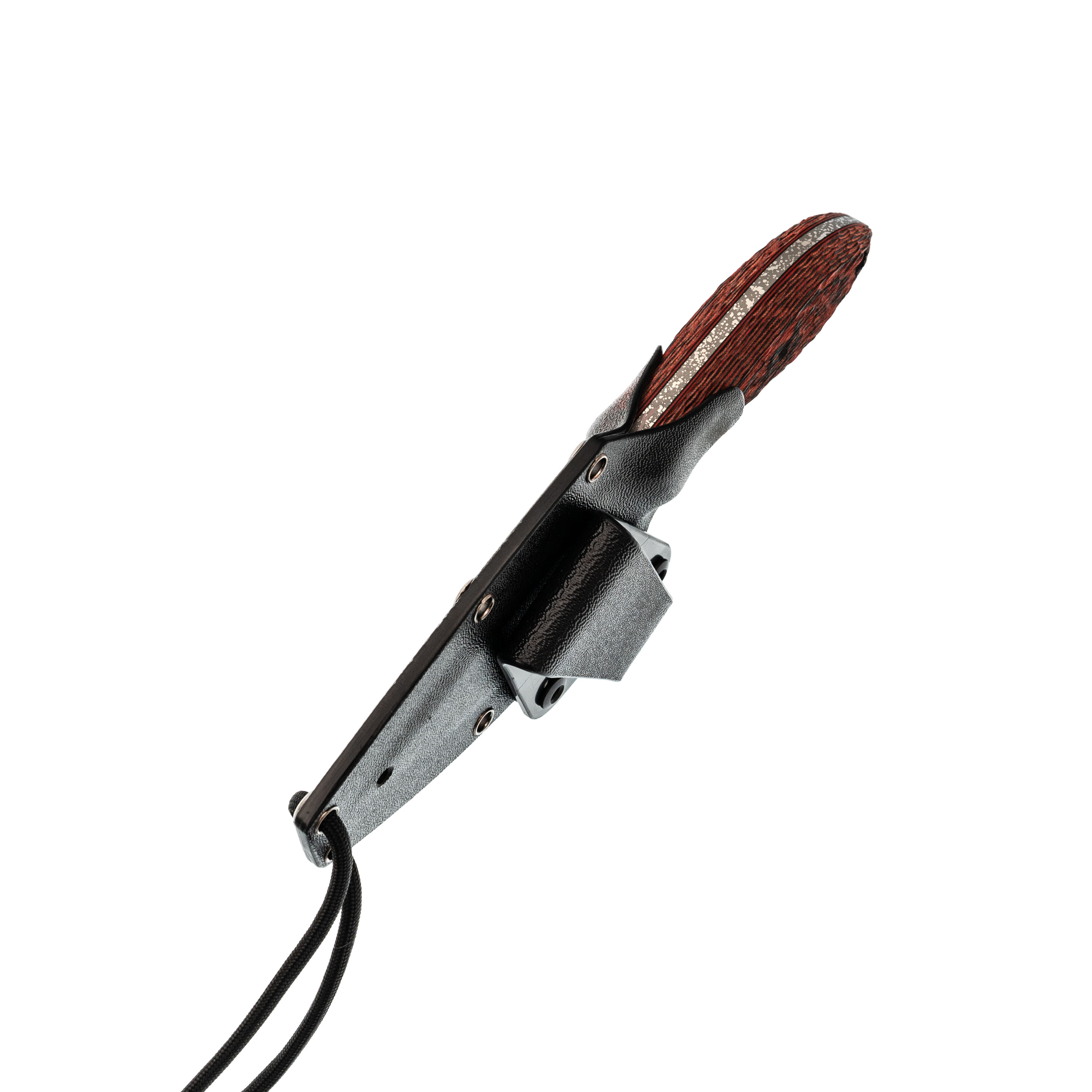 Ножны из Kydex подогнаны под клинок с хорошим усилием: нож фиксируется с характерным щелчком и не болтается внутри. В комплект входят шнур из паракорда для ношения на шее и клипса для крепления на ремень - каждый выбирает вариант под свой образ жизни. Яркая ручная роспись с мотивом Они выделяет Масичьку среди других ножей на подвесе или в ящике и делает его узнаваемым спутником на каждый день.