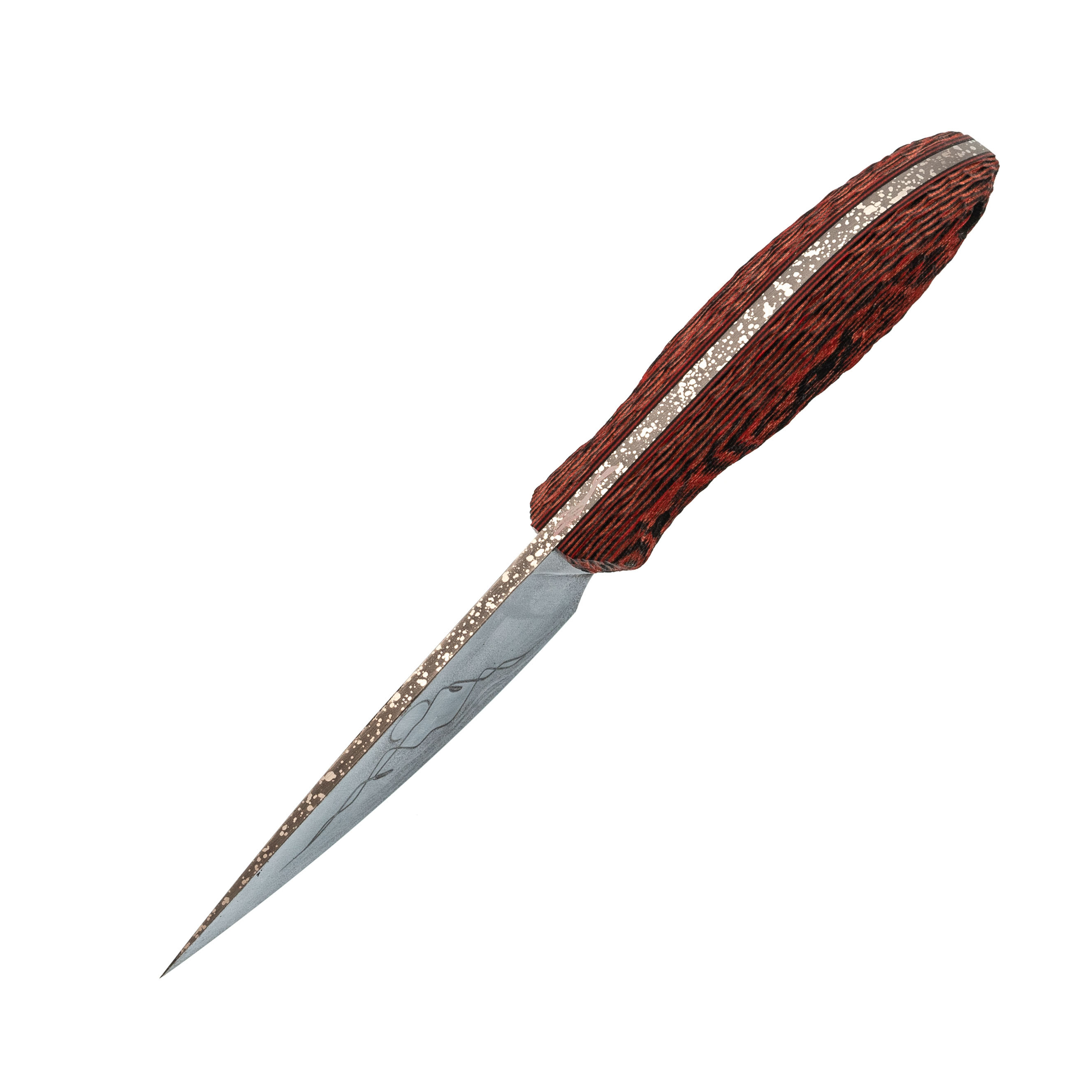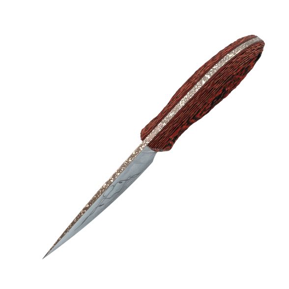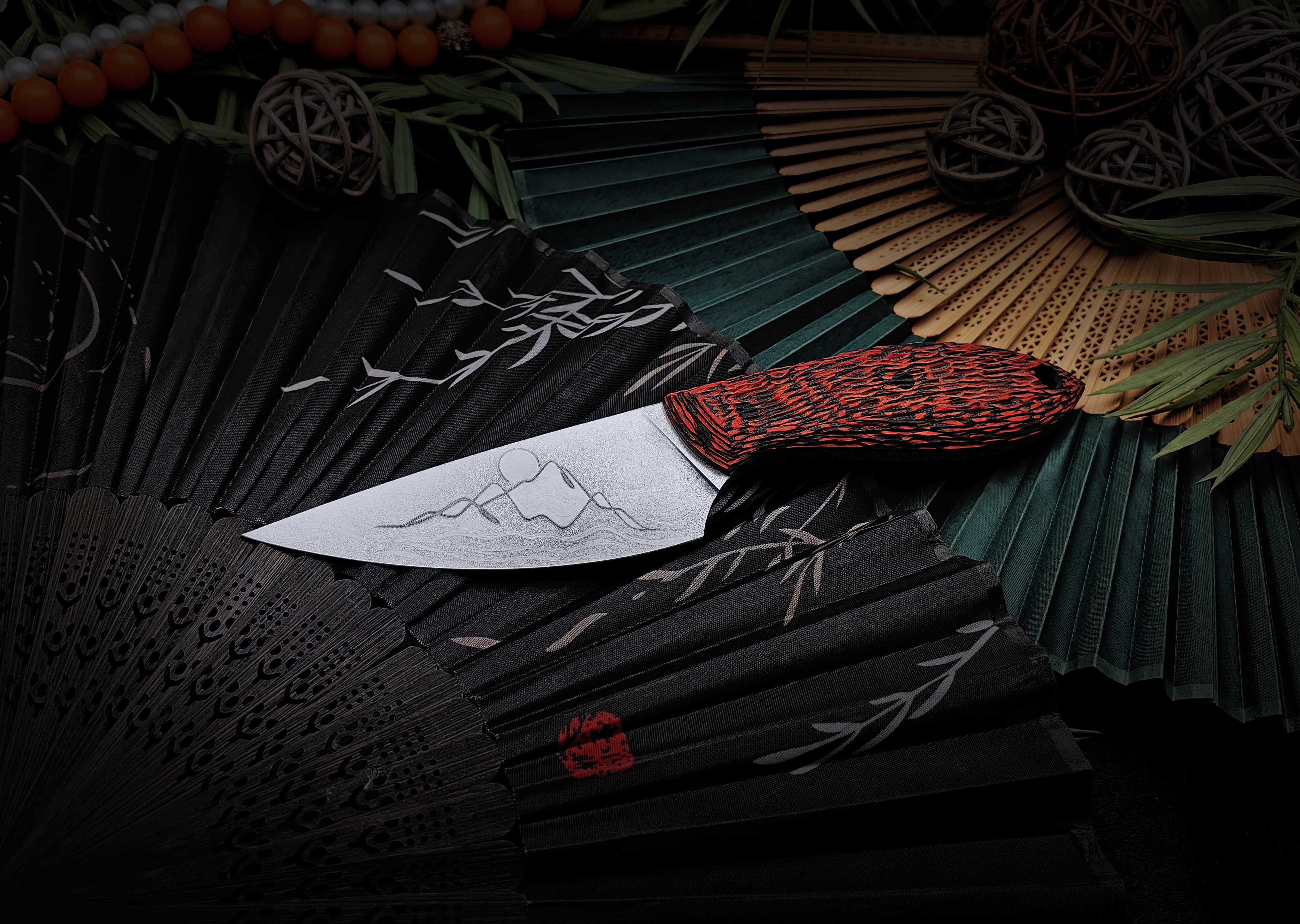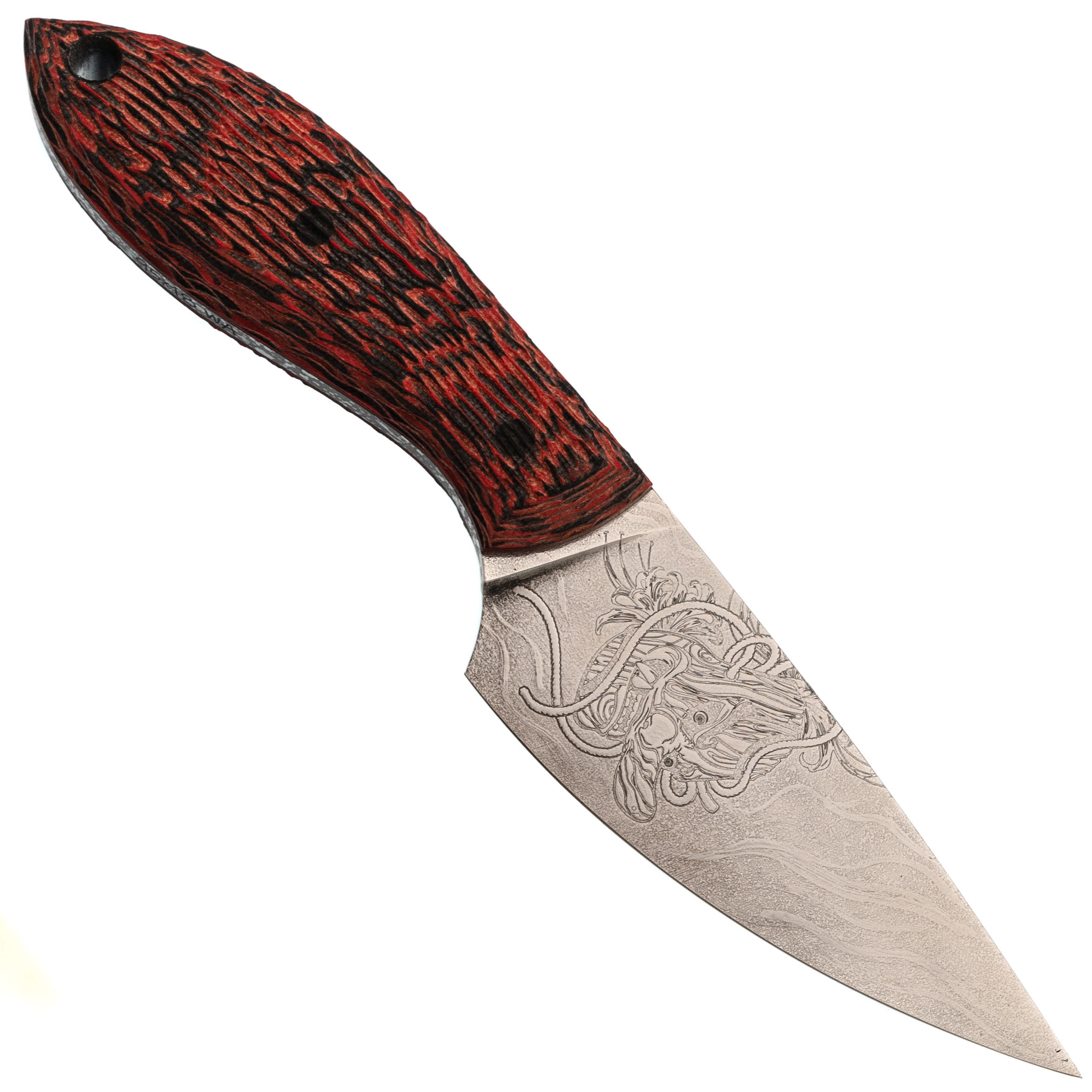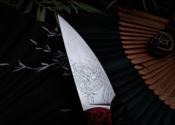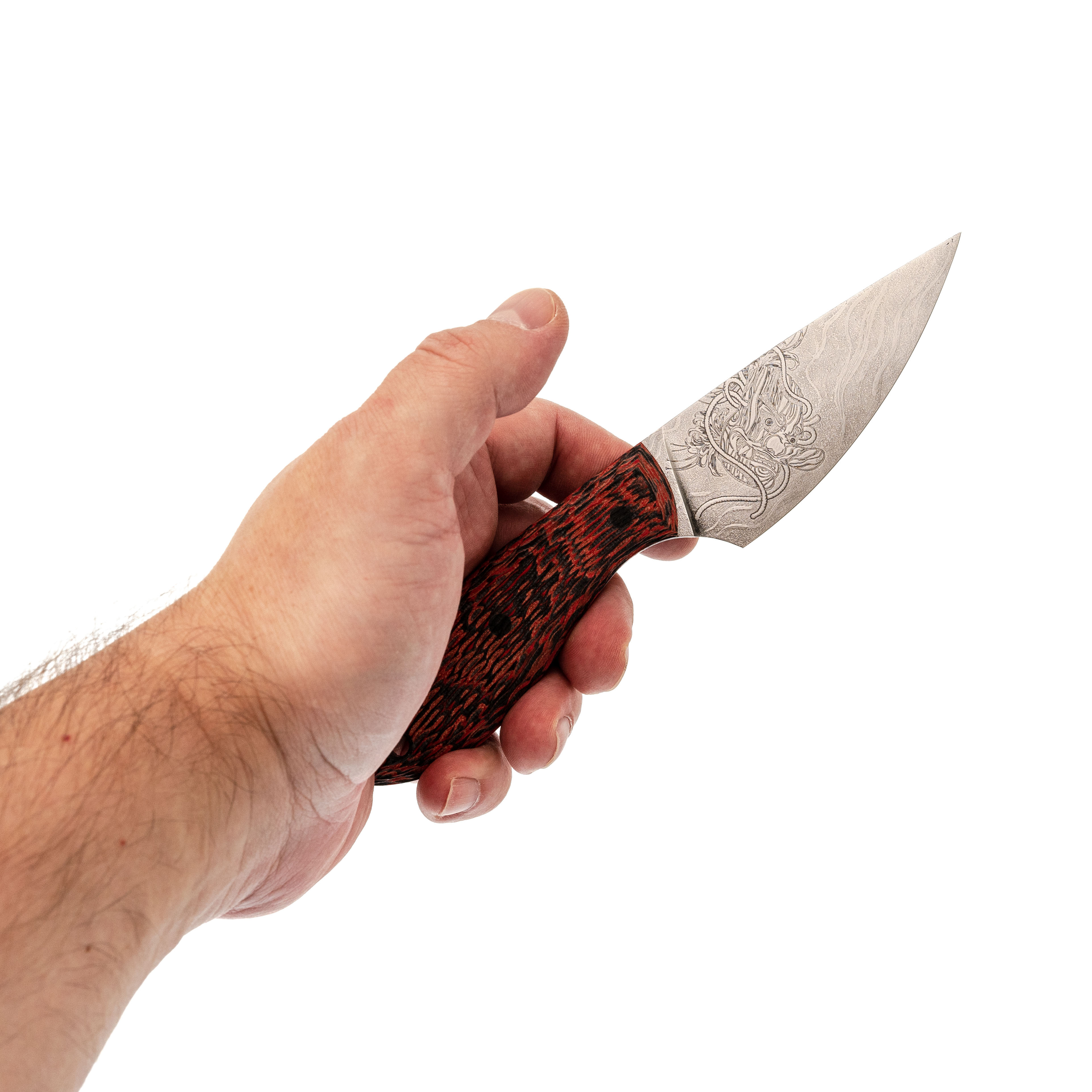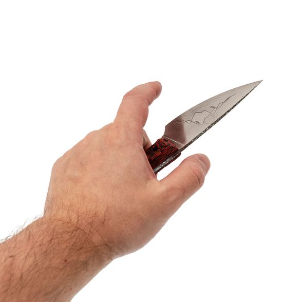 Масичька от мастерской "Волчий Век" - компактный фиксированный нож, который одинаково уверенно чувствует себя и в городе, и на выезде. Формат удобен для повседневного ношения, а по возможностям он легко закрывает задачи небольшого туристического ножа. В этом исполнении мастера дали ножу японский характер: на клинке - маска Они и гора Фудзи, на ножнах - ручная роспись в красных оттенках с тем же мотивом. Получился рабочий инструмент, который ведёт себя как серьёзный помощник, а выглядит как небольшое арт-объект.