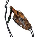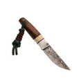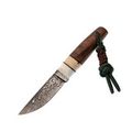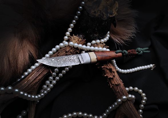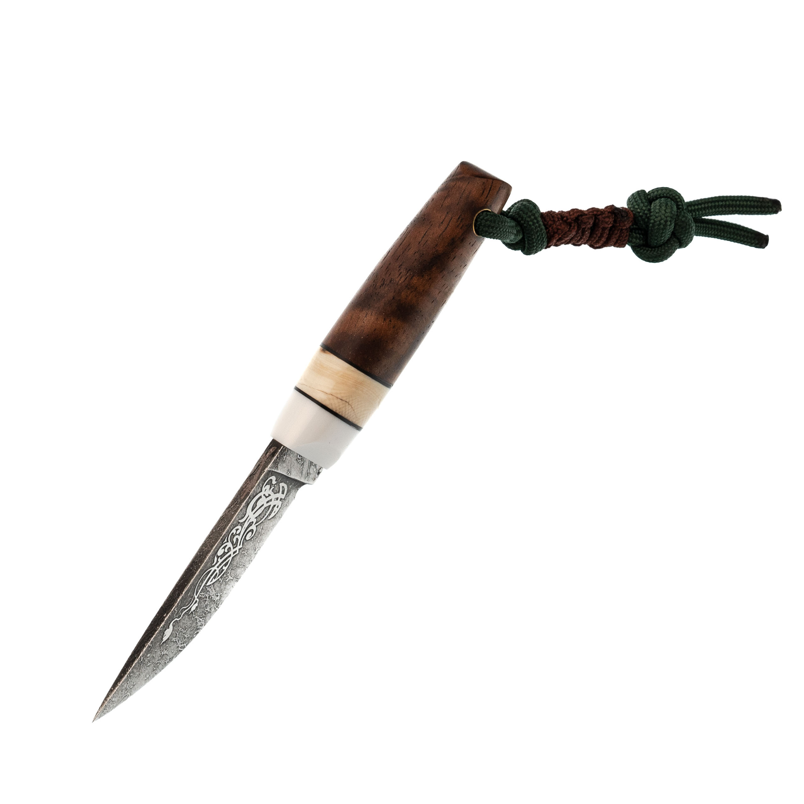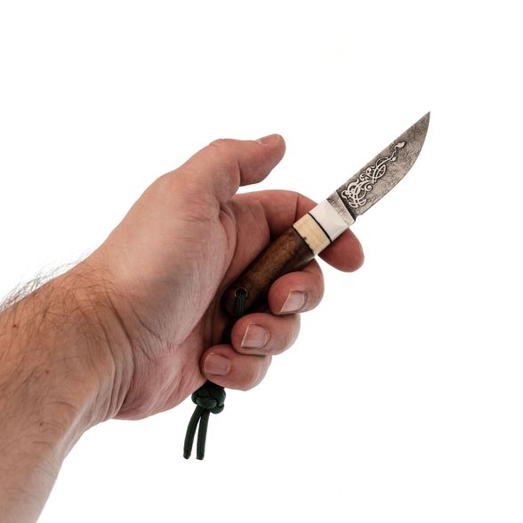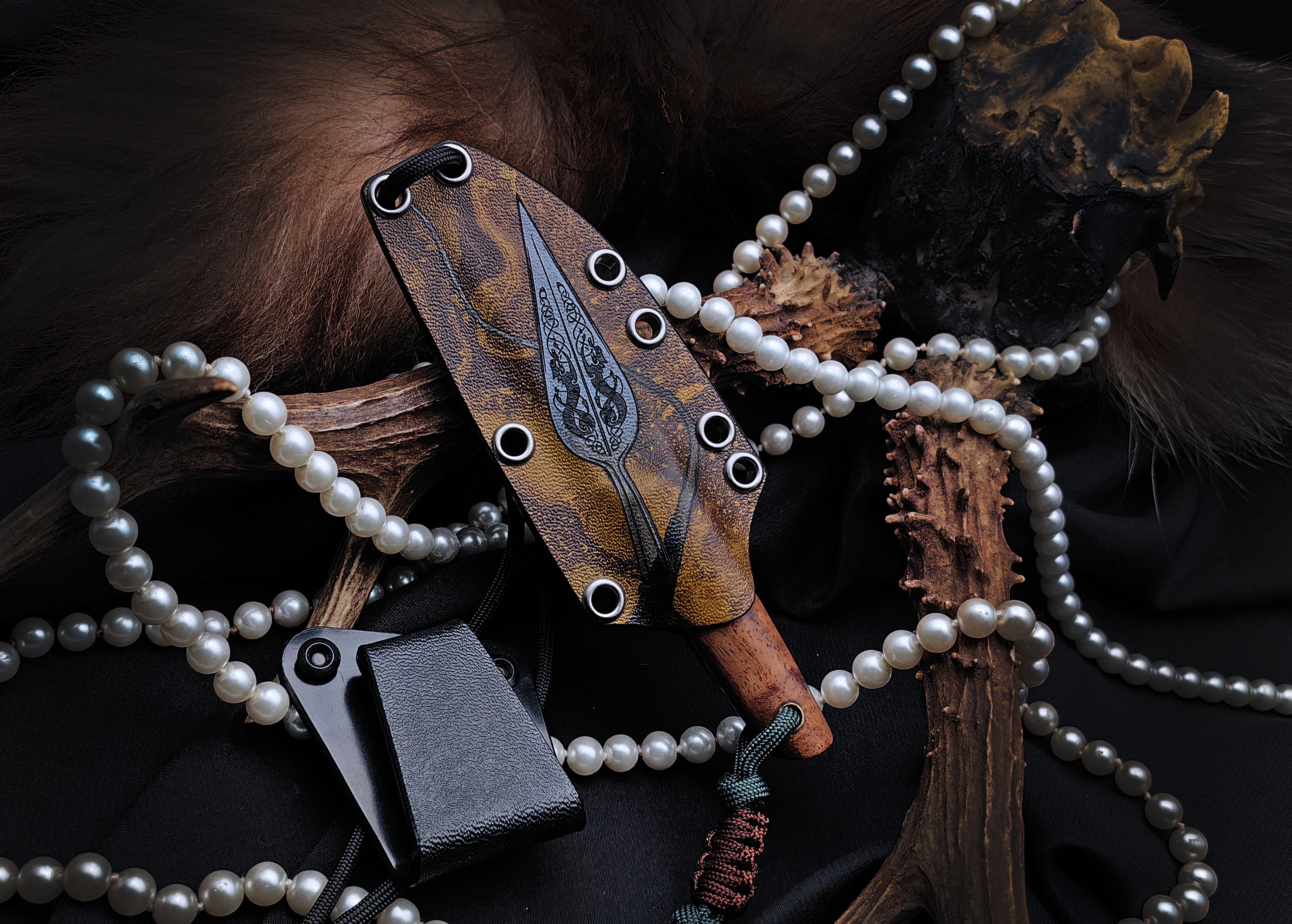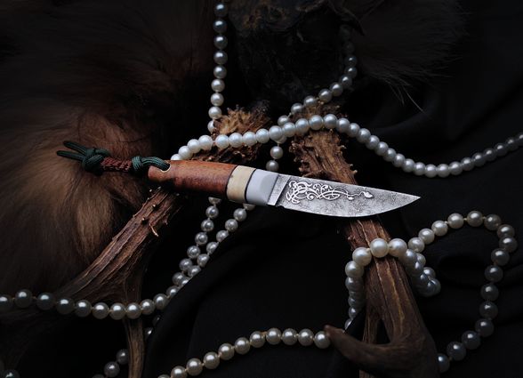 Рукоять выполнена в прямом, понятном силуэте, который не навязывает один-единственный тип хвата. Кисть спокойно находит удобное положение, а Коа добавляет цепкости и тёплых тактильных ощущений. Декоративная вставка из зуба мамонта работает как акцент и визуальная "точка притяжения" - нож приятно рассматривать, когда он лежит на столе. Темляк дополняет рукоять, помогает увереннее фиксировать нож в руке и делает модель удобной для владельцев с крупной ладонью.