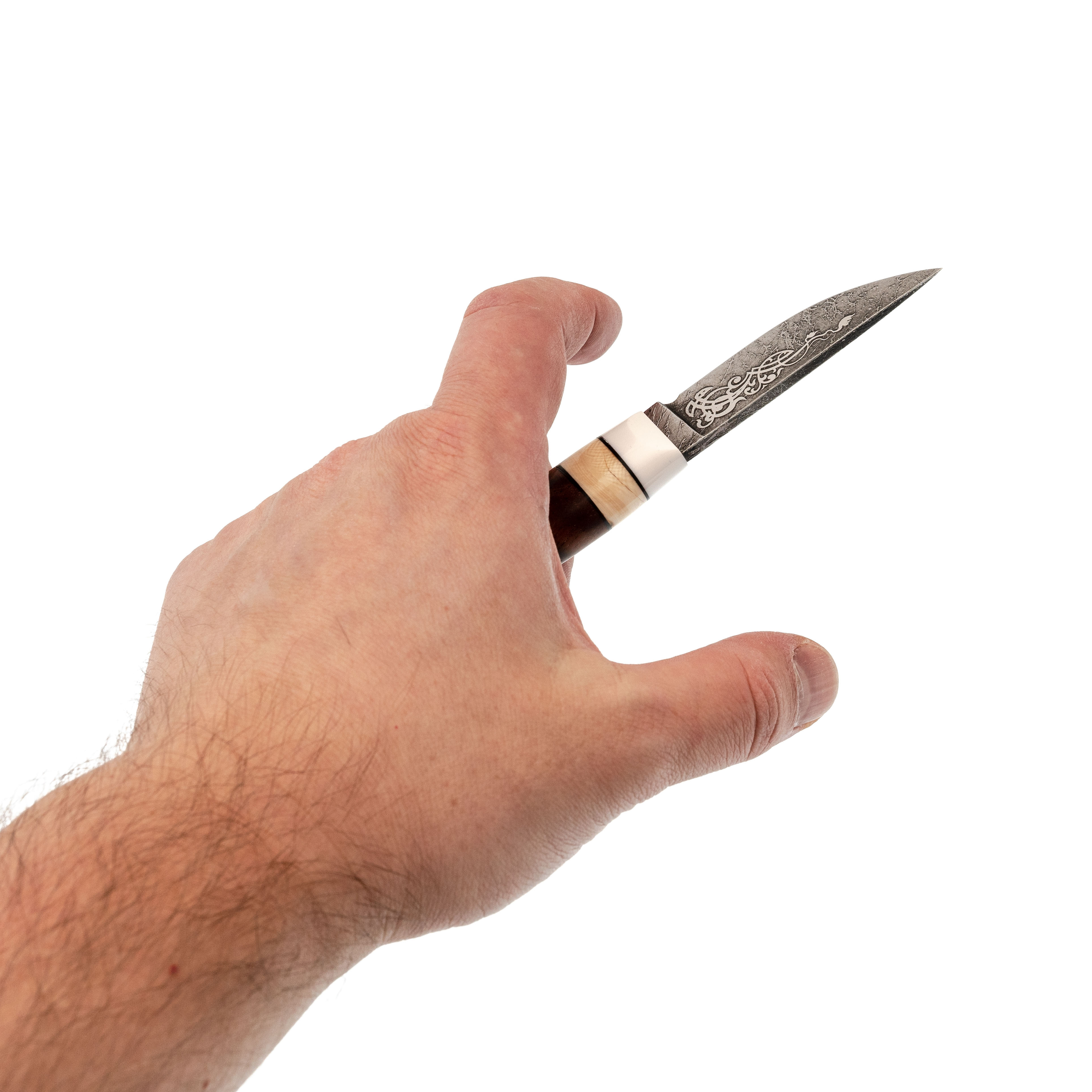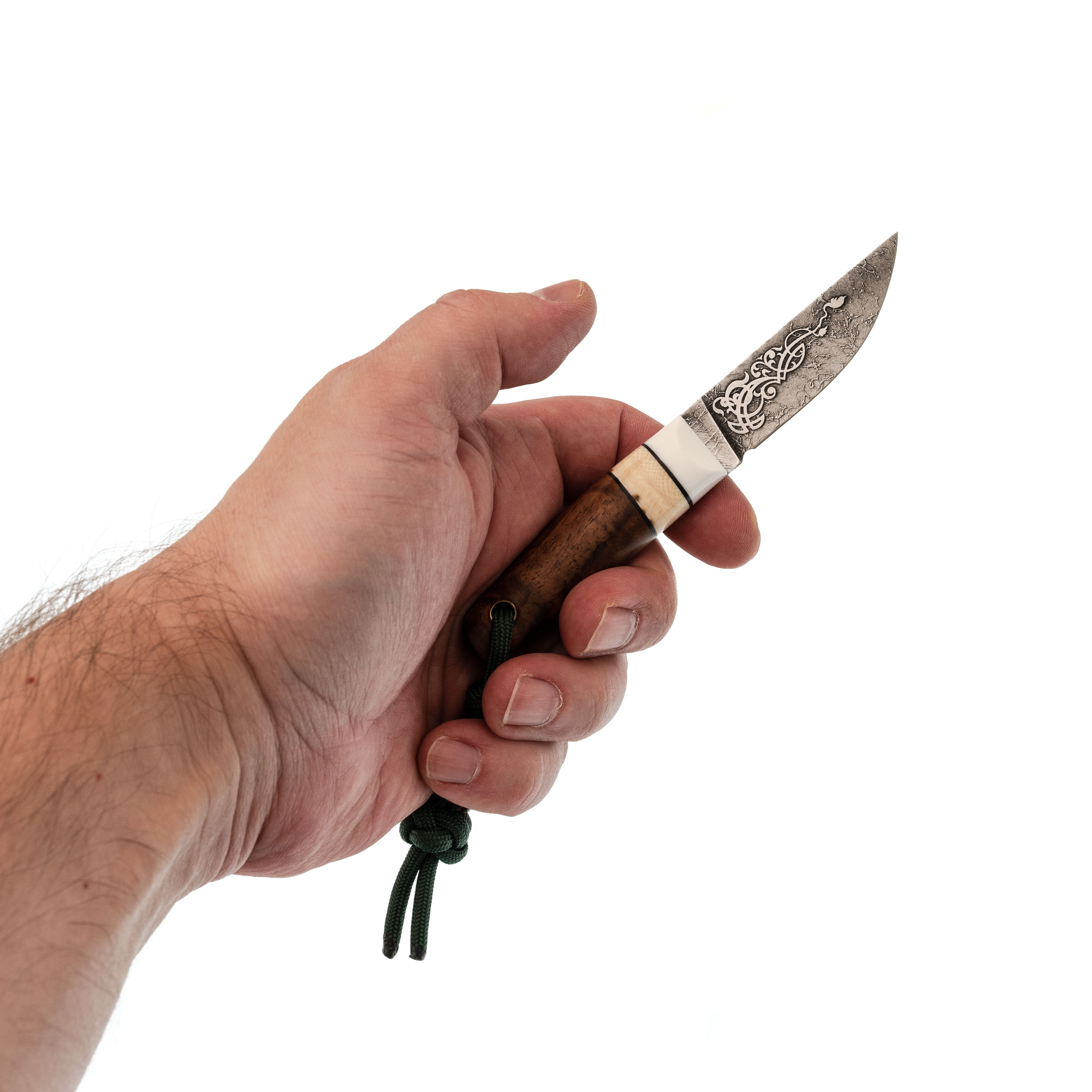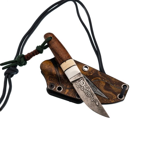 "Слоник" от мастерской "Волчий Век" - это небольшой фиксированный нож для тех, кому важны и удобство ношения, и аккуратная работа по мелочам. Его спокойно можно использовать как повседневный или шейный вариант: он не тянет карман, не мешает на поясе и в нужный момент быстро оказывается в руке. Клинок справляется с мелким ремонтом, подготовкой снаряжения, продуктами в дороге и точными задачами по материалам. Художественное травление с узором задаёт настроение: нож выглядит утончённо и дорого, сохраняя строгий, рабочий характер.