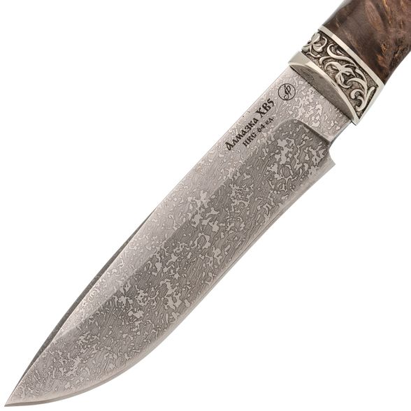 Клинок ножа изготовлен из высококачественной стали ХВ5, известной своей исключительной твердостью и долговечностью. Такая сталь обеспечивает отличную заточку, которая сохраняется длительное время. Форма клинка имеет профиль Drop-Point, а режущая кромка выполнена в виде рекурвы, что увеличивает ее длину и эффективность при разрезании материалов.