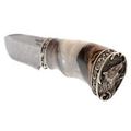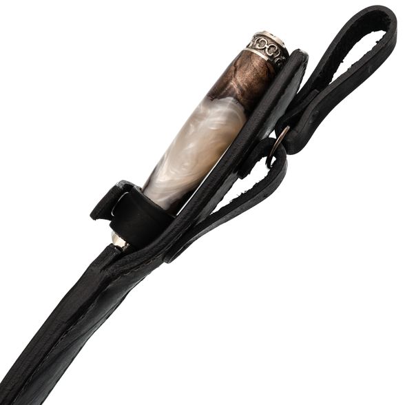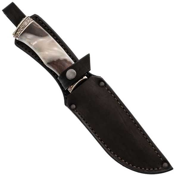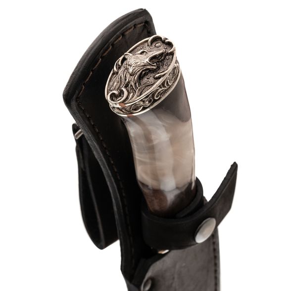 Ножны изготовлены из кожи и тщательно обработаны, что соответствует высоким стандартам мастерской. Они оснащены хлястиком для дополнительной фиксации ножа и удобным подвесом, позволяющим легко носить нож на поясе. Это идеальное дополнение к ножу, обеспечивающее его безопасность и удобство в использовании.
