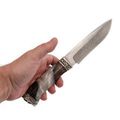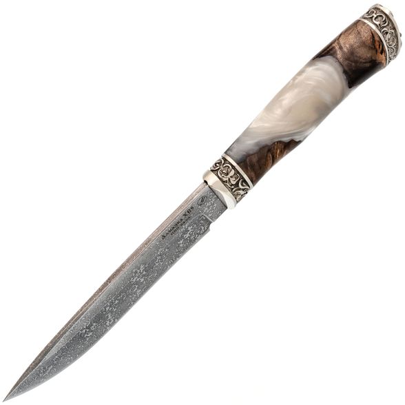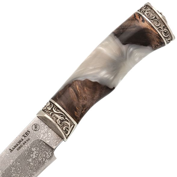 Рукоять "Волка-2" - это сочетание карельской берёзы и акрила, обеспечивающее не только эстетичный вид, но и практичность. Такие материалы устойчивы к воздействию влаги, низких и высоких температур, что делает нож универсальным для различных условий. Рукоять имеет удобную эргономичную форму с изгибом, что обеспечивает комфортное и надежное удержание.
