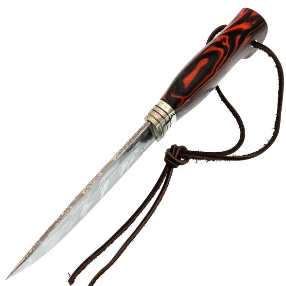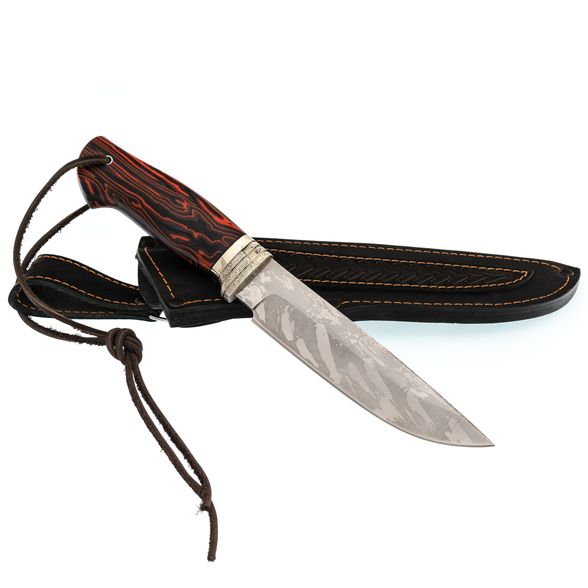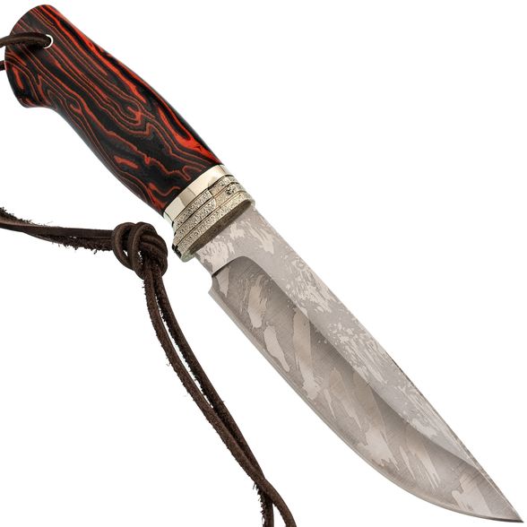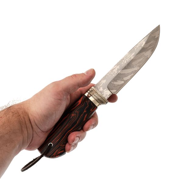 Рукоять изготовлена из слоёной микарты, которая сочетает прочность, лёгкость и влагостойкость. Этот материал отличается уникальным узором, который создаёт приятный внешний вид каждого изделия. Форма рукояти тщательно выверена: она обладает эргономичным изгибом, что позволяет ножу комфортно лежать в руке даже при интенсивной работе. Объёмность рукояти снижает риск натирания ладони, что особенно важно для длительного использования.