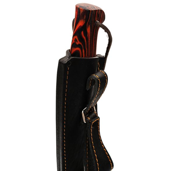 Ножны выполнены из натуральной кожи высокого качества, что обеспечивает их надёжность и долговечность. Толстая кожа защищает нож от внешних повреждений и износа. Погружная конструкция ножен плотно удерживает нож внутри, обеспечивая его безопасность в любых условиях. При этом нож легко и быстро извлекается, что делает его удобным для оперативного использования в полевых условиях.