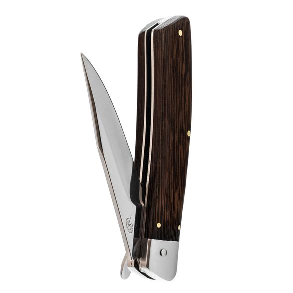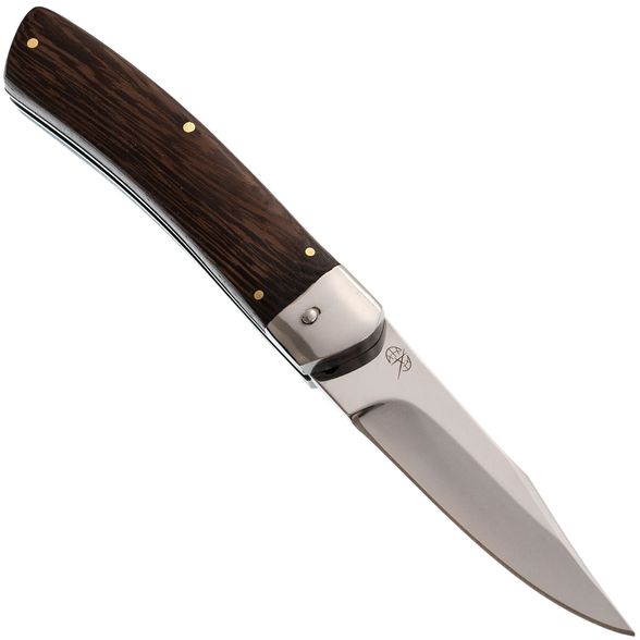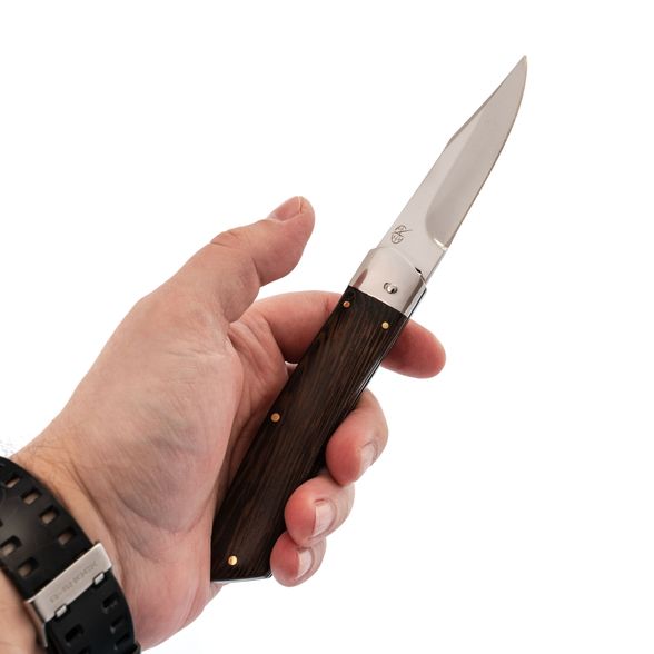 Сборной рукоятки, состоящей из двух деревянных накладок, прикрепленных к металлическому каркасу. Изготовлена ручка на маленьких бронзовых заклепках, которые сочетаются с деревянными накладками. Мастер изготовил функциональный армейский нож. На рукоятке имеется клипса в виде небольшого лепестка, с помощью которого носимый атрибут прочно удерживается на любом элементе одежды. Дерево пропитано специальным водоотталкивающим составом, благодаря которому ручка сохраняет внешний вид в экстремальных условиях эксплуатации.