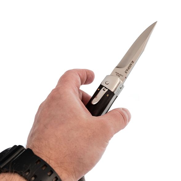 Представляем в продаже нож выкидной Капрал. Это компактная модель с коротким клинком длиной до 90 мм. Презентабельно выглядит и обладает прочной конструкцией, но использовать в качестве метательного не рекомендуется. Эргономичная рукоятка хорошо укладывается в ладони. Для ношения на одежде имеется откидная подпружиненная клипса. Клинок на каждый день с компактными габаритами из прочных материалов.