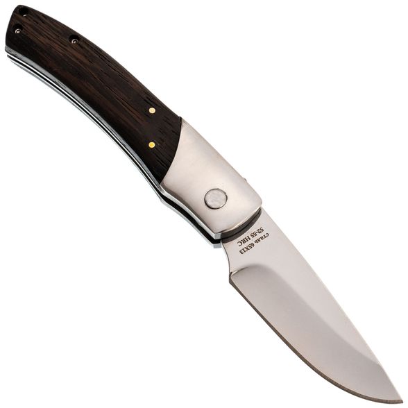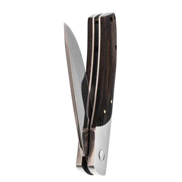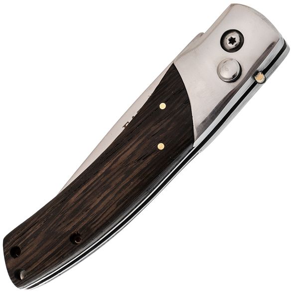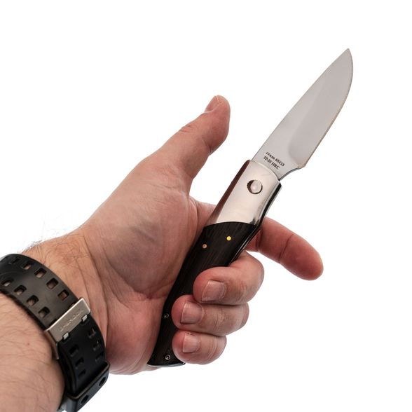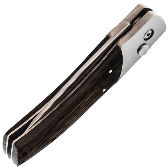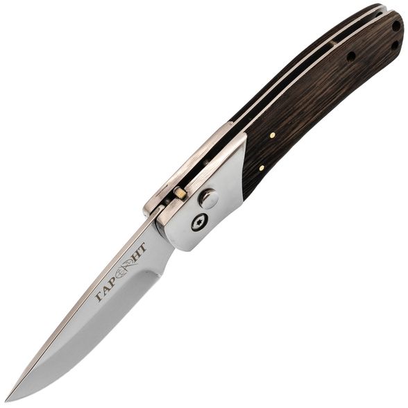 Выкидной нож Гарант представляет собой универсальный автоматический нож, способный эффективно выполнять различные виды работ и доступный по привлекательной цене. Клинок ножа имеет размеры 86 мм, сделан из стали 65х13 толщиной 3 мм, и обладает универсальной формой и спусками от середины, что обеспечивает оптимальный баланс между чистым резом и прочностью. Рукоять, украшенная деревянными накладками в сочетании со стальными больстерами, придает ножу стильный старомодный вид, а также обеспечивает комфортное удержание.