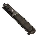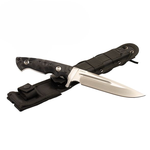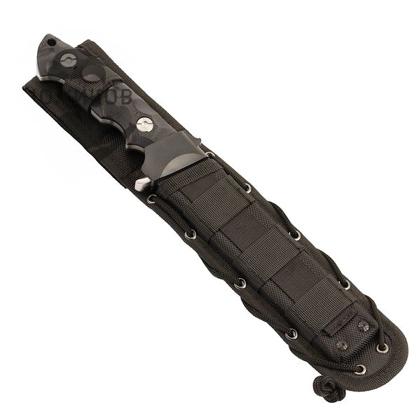 Нож комплектуется пластиковыми ножнами с внешним нейлоновым чехлом из Cordura. Система креплений позволяет фиксировать нож как на ремне, так и на снаряжении с интерфейсом Molle. Дополнительный шнур даёт возможность закрепить нож на бедре, исключая его смещение при активных перемещениях. Всё это делает транспортировку и доступ к ножу удобными в любых условиях.