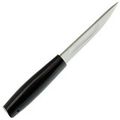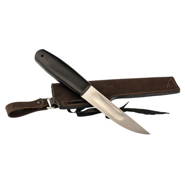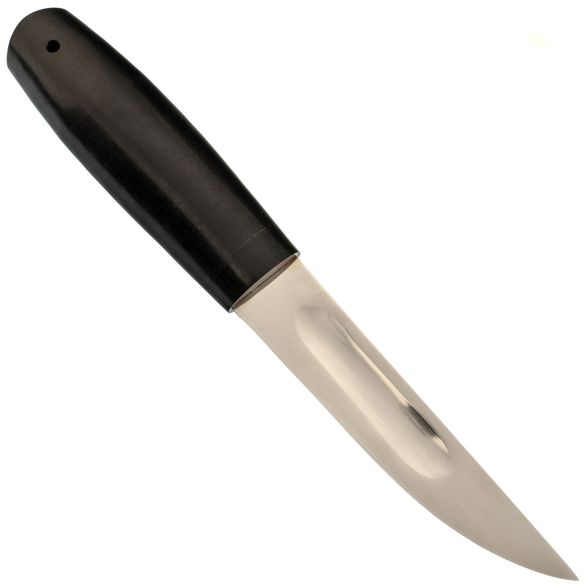 К работе таким ножом нужно привыкнуть. Эта модель имеет одностороннюю заточку с левой стороны клинка. Однако в процессе работы приходит понимание, что работать таким ножом очень удобно. Односторонняя заточка легко справляется со строганием твердой древесины, работой по замороженным продуктам и выполнением других тяжелых работ. В использовании такого ножа есть еще один огромный плюс - нож с такой заточкой легко точить, так как нет необходимости выдерживать угол. Просто положите нож на спуск и плавно водите ножом по бруску. Бочкообразная рукоять уверенно удерживается рукой в теплой перчатке.