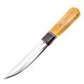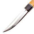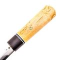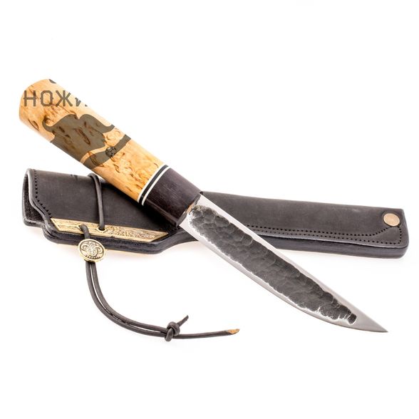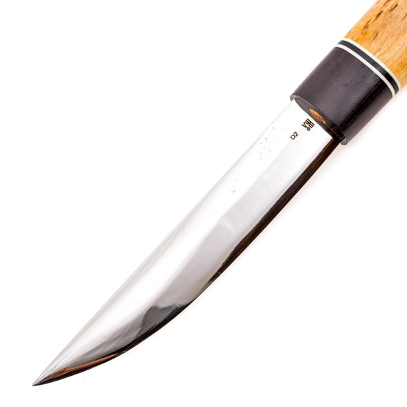 НОЖ ЯКУТ, СТАЛЬ D2, РУКОЯТЬ КАРЕЛЬСКАЯ БЕРЕЗА выполнен в аутентичной стилистике. Якутские ножи - часть ножевой истории Русского государства. Первые якутские ножи известны на Руси с XV века. Свое название нож получил по названию региона, в котором он был широко распространен. Нож такого типа был у каждого уважающего себя якута. При выборе этой модели стоит обратить внимание на одностороннюю заточку клинка, что требует некоторого привыкания в процессе работы. Дизайнеры бренда возрождают традиции создания национальных ножей, но при этом предпочитают использовать современные материалы. Так, здесь используется американская холоднокатаная сталь D2, которая долго держит заточку и имеет агрессивный рез, что позволяет агрессивнее впиваться в разрезаемый материал. Рукоять выполнена из стабилизированного граба и стабилизированной карельской берёзы. Эти сорта древесины сами по себе прочные, но после стабилизации они становятся по свойствам как пластик, сохраняя при натуральный внешний вид. Ножны как отдельный вид исскуства выполнены в традиционной форме и имеет свободый подвес состоящий из верёвки. При этом для украшения на ножнах есть пластинки из латуни с художественным литьём.
