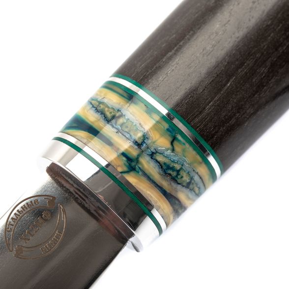 Рукоять: притин 5мм дюраль, тонкая зеленая проставка, тонкая дюраль, 15 мм стабилизированный зуб мамонта в акриле, у пятки элементы когтей, отверстие под темляк