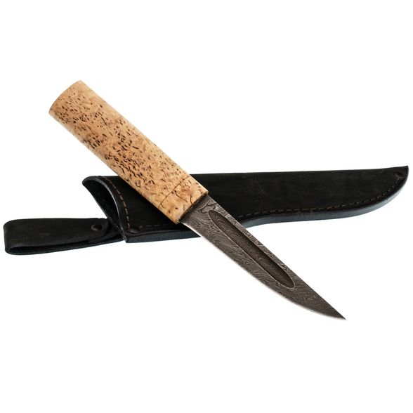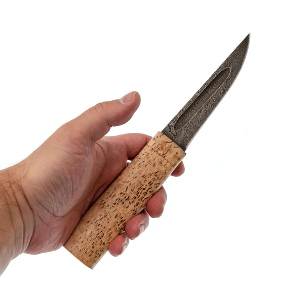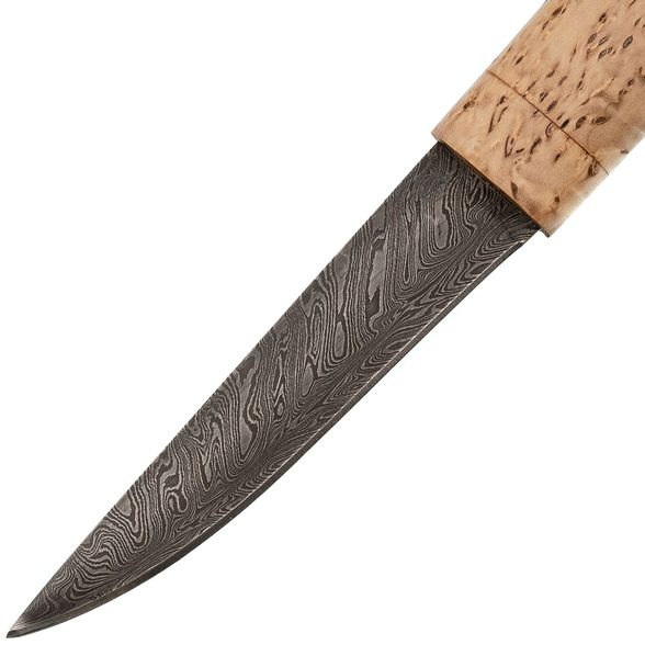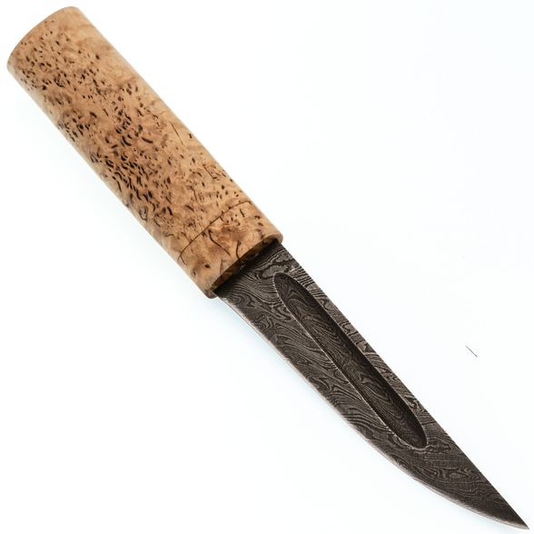 Клинок ножа откован вручную в традиционной форме якутского ножа. С одной стороны ножа лезвие плоское, имеет откованный дол.