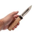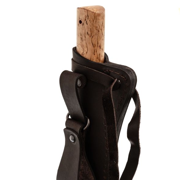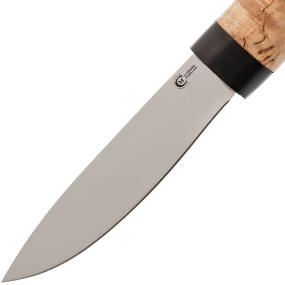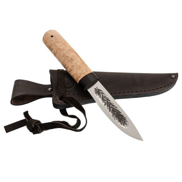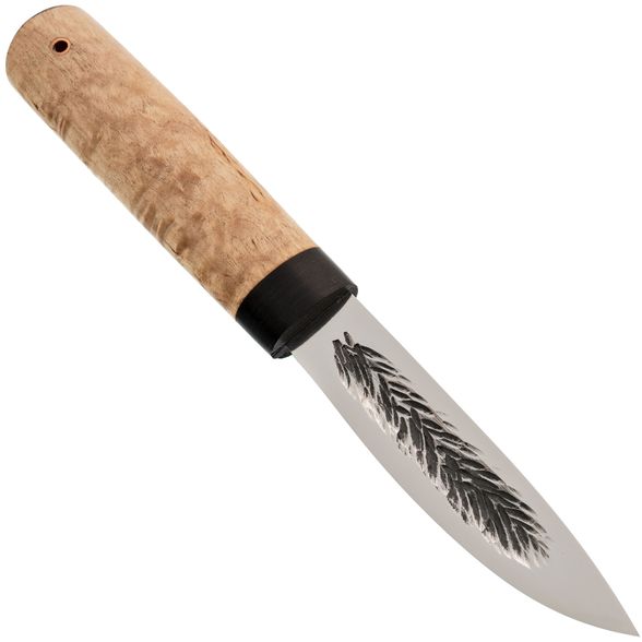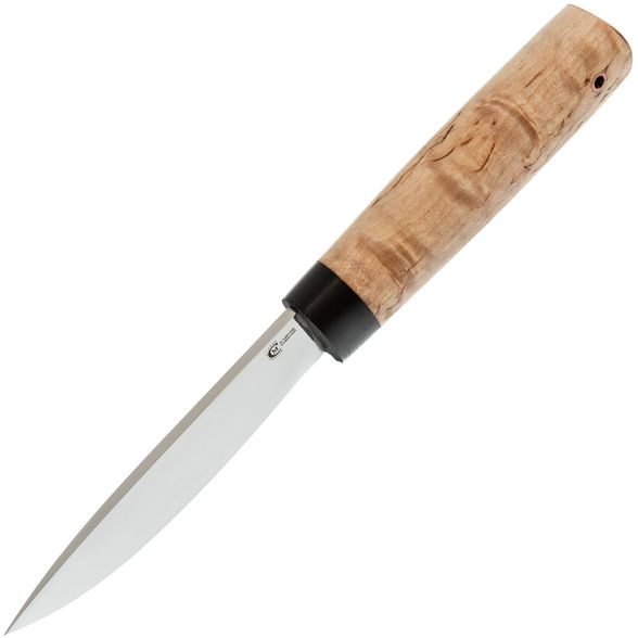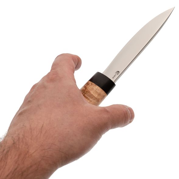 Рукоять изготовлена из карельской берёзы, древесины, известной своей прочностью и уникальным рисунком. Завитушки на рукояти придают ножу не только эстетичный вид, но и улучшают сцепление с рукой. Простая, но эргономичная форма рукояти обеспечивает комфортное и надежное удерживание ножа.