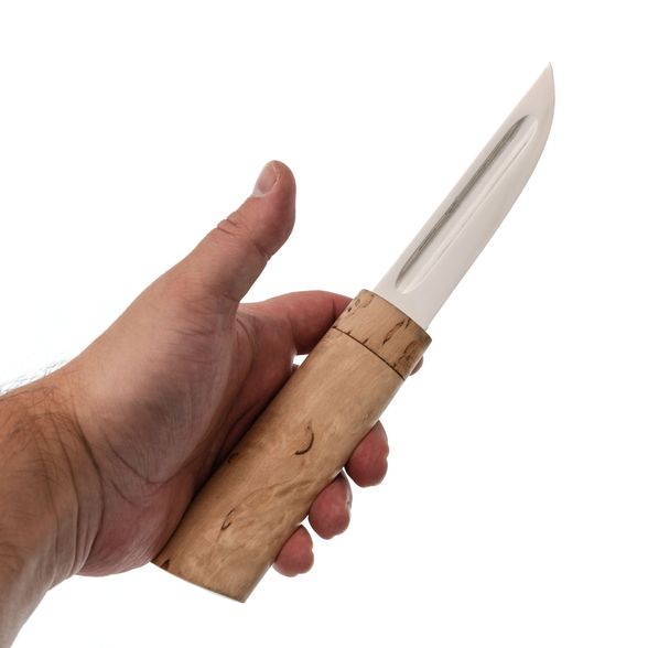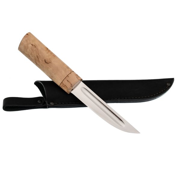 Клинок ножа откован вручную в традиционной форме якутского ножа. С одной стороны ножа лезвие плоское, имеет откованный дол.
