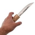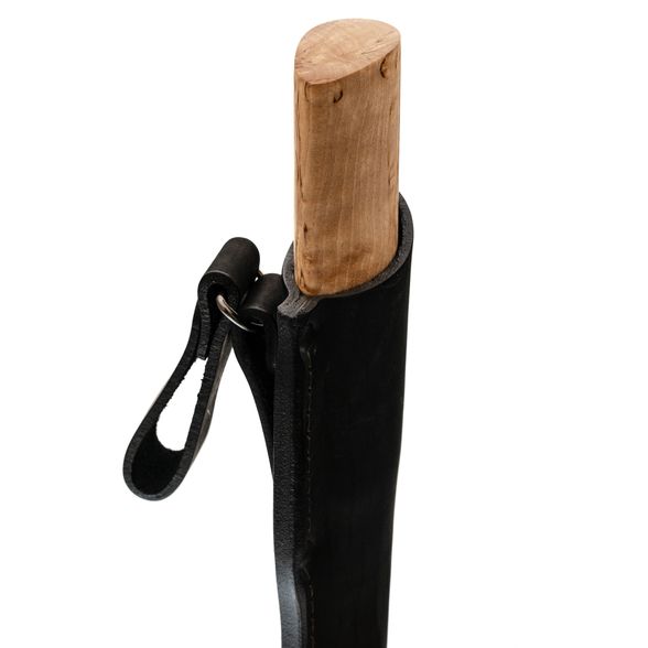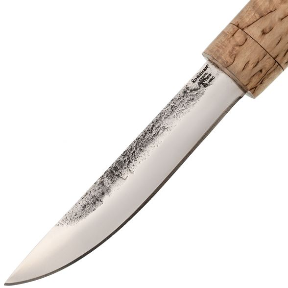 Клинок откован в клин по обуху. Противоположная сторона клинка выгнутая, чтобы при работе нож "не зарывался" в материал.