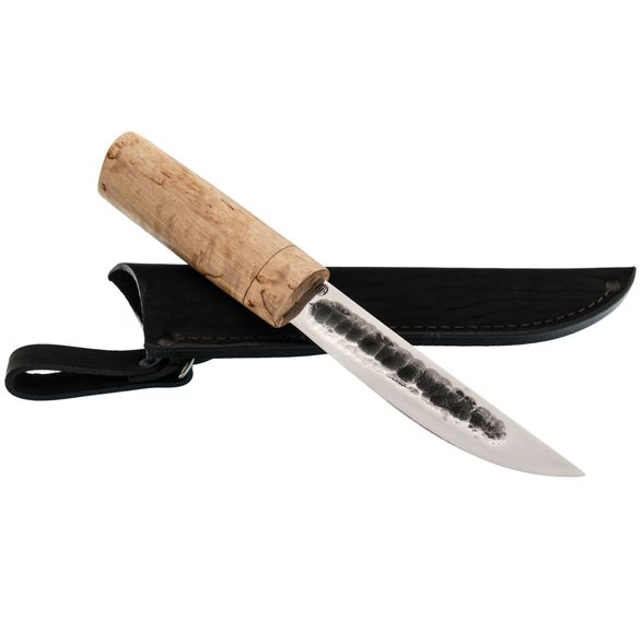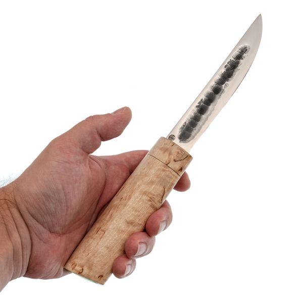 Клинок ножа откован вручную в традиционной форме якутского ножа. С одной стороны ножа лезвие плоское, имеет откованный дол.