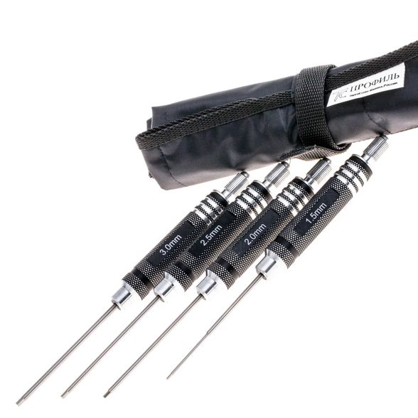 ОТВЕРТКИ "ПРОФИЛЬ", ПРОФЕССИОНАЛЬНЫЙ НАБОР В ЧЕХЛЕ 4 ШТ. это настоящий подарок для владельца точилки Профиль или любой другой аналогичной точилки. В состав набора входят четыре отвертки с шестигранными наконечниками разного размера. Отвертки подобраны таким образом, чтобы владельцу точилки не пришлось пользоваться другим инструментом. С помощью отверток из набора вы легко закрепите станок на столе, отрегулируете длину штанг и сможете с полной самоотдачей приступить к любимому занятию: вжик-вжик. Комплект размещается в удобной сумке-скатке, которая выполнена из надежного синтетического материала.