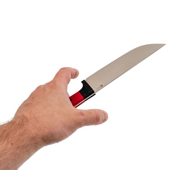 Клинок ножа изготовлен из японской стали VG-10, что гарантирует однородную структуру металла и отличные режущие характеристики. Ширина лезвия оптимизирована для нарезки овощей, мяса и хлеба, а прямые спуски от тонкого обуха 2,5 мм обеспечивают минимальное сопротивление при работе. Финишная заточка и полированная поверхность придают клинку эстетичный вид и облегчают очистку после использования.