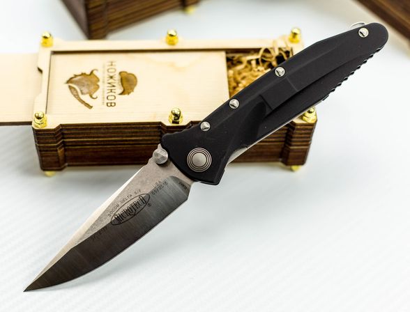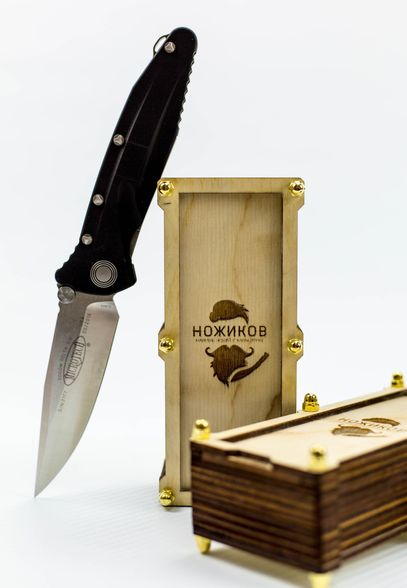 В коробку помещаются большинство складных ножей. Сам нож погружается в декоративную стружку, благодаря чему не бьется и не царапается о стенки. Выдвижная крышка фиксируется за счет трения.
