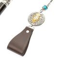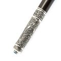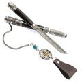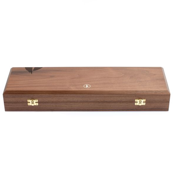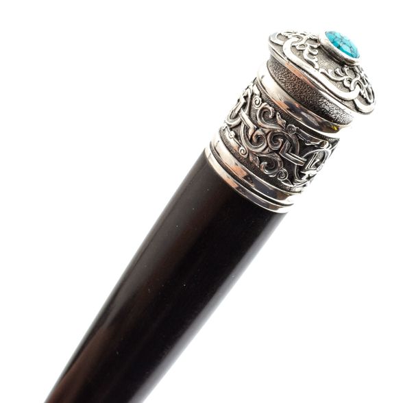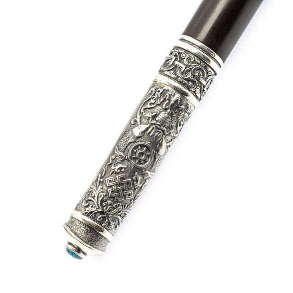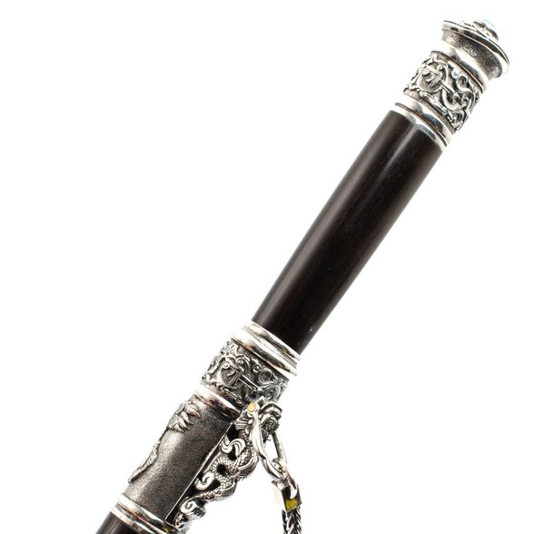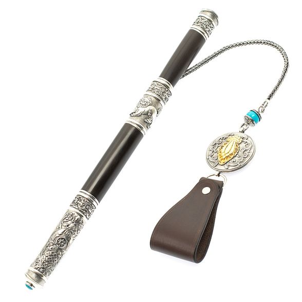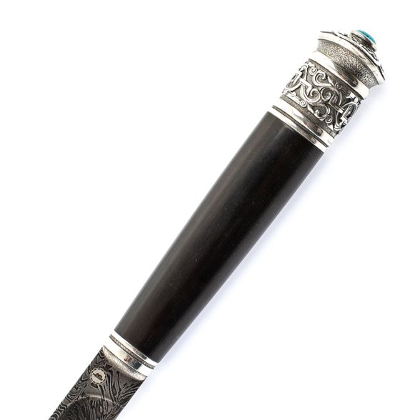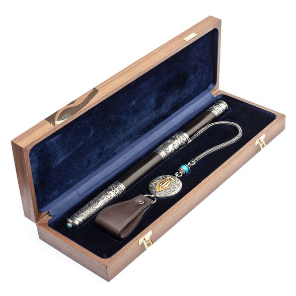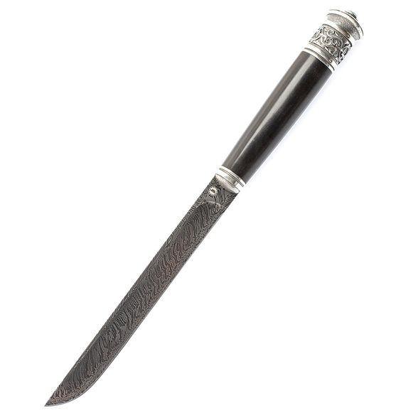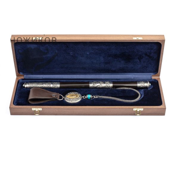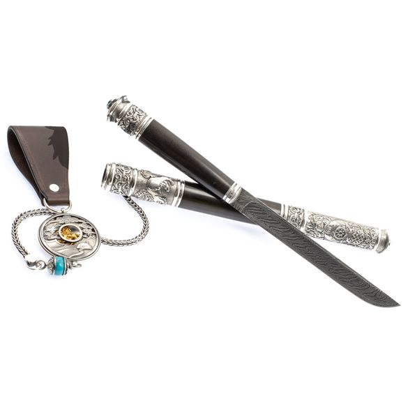 Подарочный нож Бурятский с подвесом, нержавеющая сталь, рукоять дерево — это отличный подарок для настоящих ценителей ножевого искусства. Сразу обращает на себя внимание внимательное отношение к мельчайшим деталям. Литые элементы ножен и рукояти украшены резьбой и гравировкой с использованием национальных бурятских символов. Среди интересных моментов стоит отметить особенное устройство подвеса с использованием кожаной петли и металлического медальона. Все элементы художественного литья выполнены из бронзы, на поверхность которой нанесено серебрение гальваническим способом. Клинок ножа выполнен методом ручной ковки.