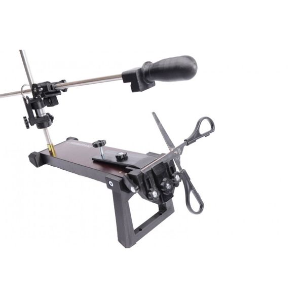 Дополнительный модуль для заточного приспособления Складишок позволяет заточить ножницы с жестко зафиксированным углом и добиться остроты вашего режущего инструмента. На фронтальной части приспособления реализованы прижимная планка и 2 упора слева и справа от нее, которые могут двигаться вверх-вниз и в стороны, так же с левой стороны находится боковой упор (флажок), с задней части есть винт для регулировки прижимной планки