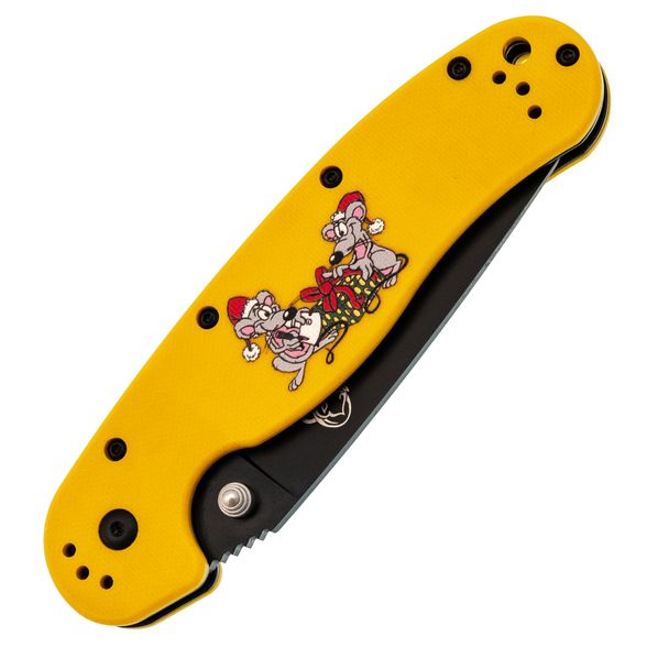 Рукоять эргономичная, уверенно сидит в ладони. На накладках - рисунок с крысами, которые празднуют Новый год. Деталь добавляет настроения, не отвлекая от работы. Клипса переставляется во все четыре положения.