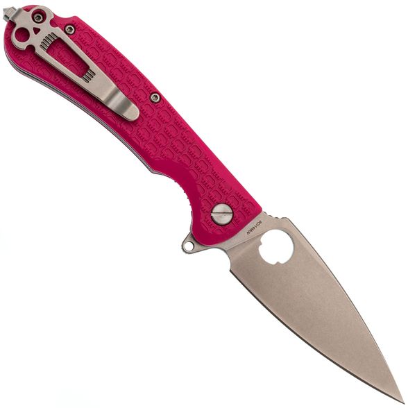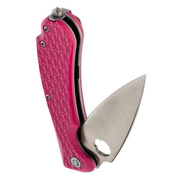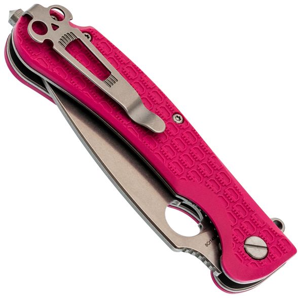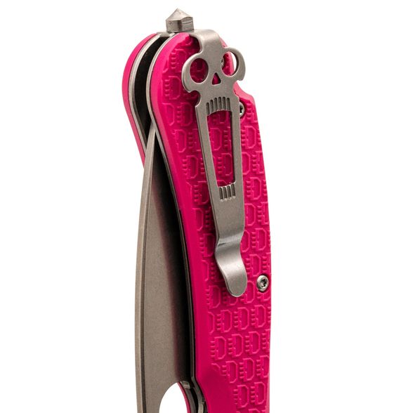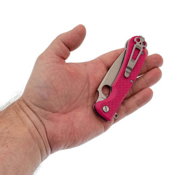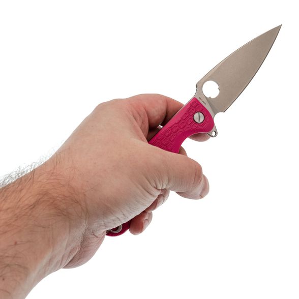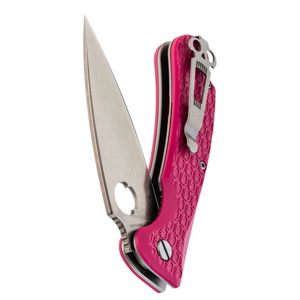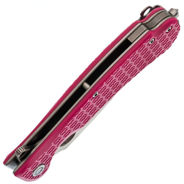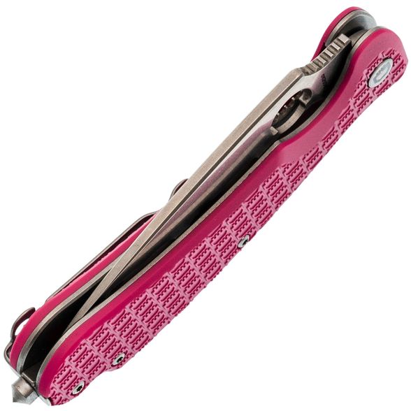 Рукоять изготовлена из нержавеющей стали и термопластика FRN – стальные лайнера служат прочной основой, на которую крепятся накладки. Термопластик FRN легкий, прочный и неприхотливый, а сталь гарантирует надежность конструкции. Яркий розовый цвет рукояти придает ножу оригинальный вид, а замок Liner-Lock обеспечивает безопасность для любых повседневных задач.