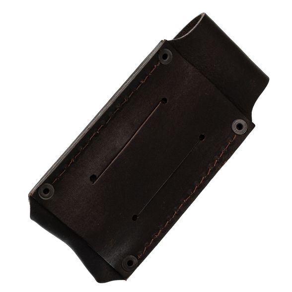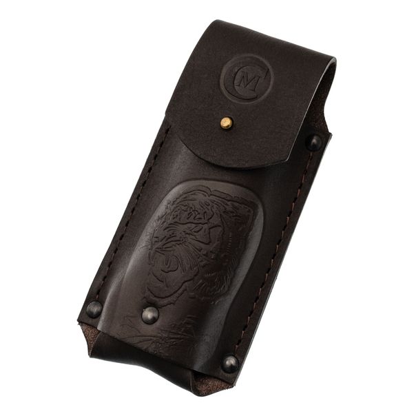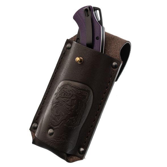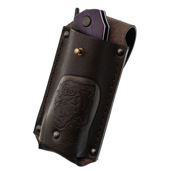 Чехол из натуральной кожи надёжно удерживает нож и позволяет удобно носить его в кармане. Он практичен, долговечен и хорошо сочетается с общей стилистикой ножа.