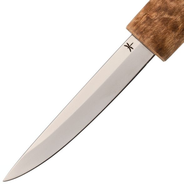 Клинок ножа Сындыыс отличается оригинальной геометрией: с одной стороны — плоский, как стамеска, с другой — с линзовидным спуском. Такая форма пришла из северных традиций и отлично проявляет себя при работе с древесиной, разделке рыбы или замороженных продуктов. Компактные размеры делают его особенно удобным при мелких задачах, требующих точности и контроля.