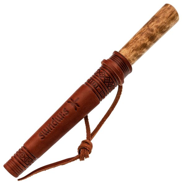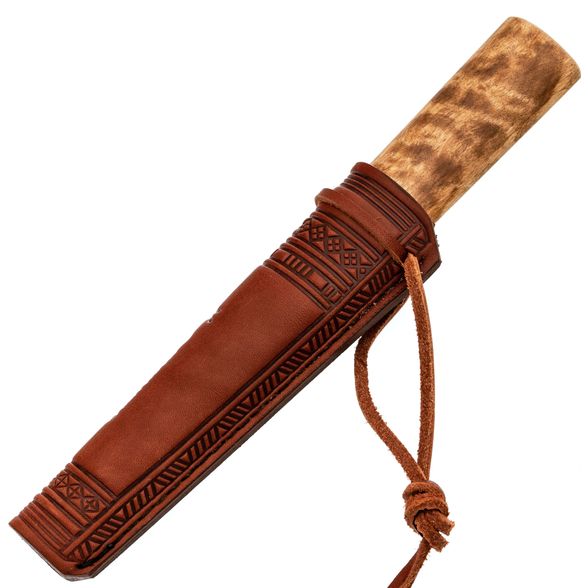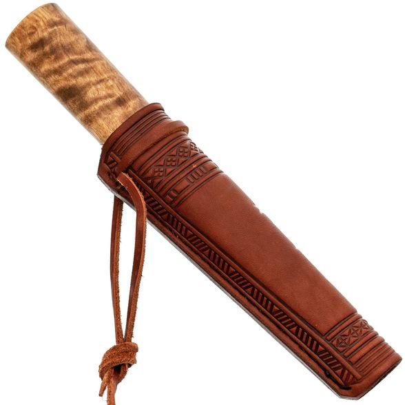 Ножны из дерева, обтянутые кожей, обеспечивают плотную посадку ножа — он буквально "щёлкается" внутрь, надёжно удерживаясь даже при движении. Подвес реализован на кожаном шнурке, что даёт возможность носить нож как на поясе, так и на шее, адаптируя под разные условия и уровни активности.