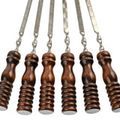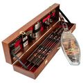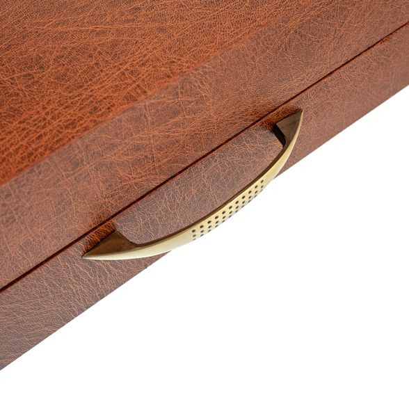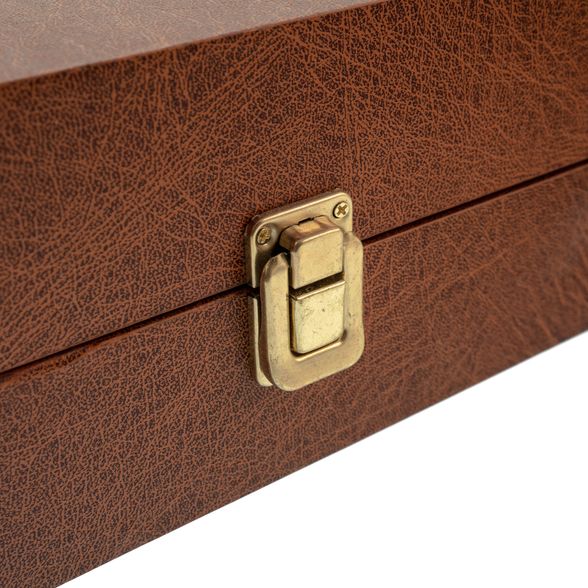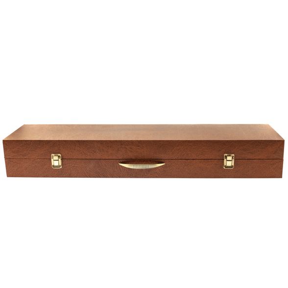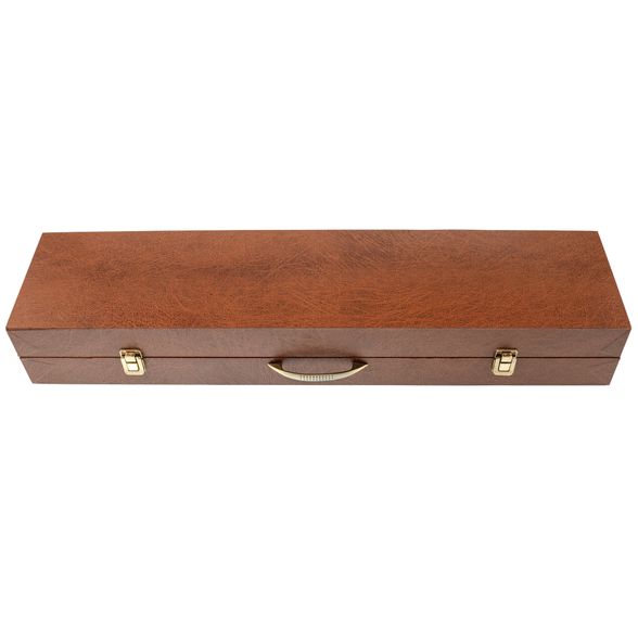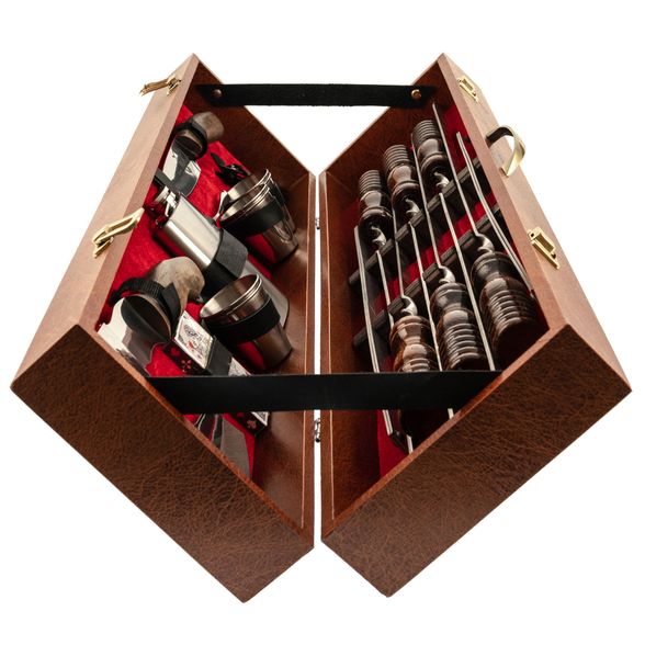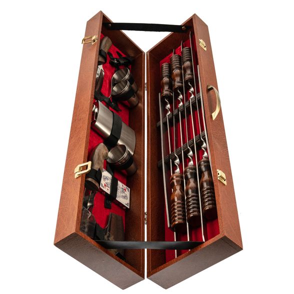 Шашлычный набор упакован в элегантный кейс, который не только впечатляет своим внешним видом, но и обеспечивает надежную защиту содержимого. Снаружи он обтянут кожей, которая красиво сочетается с латунной фурнитурой, придавая всему набору изысканный и роскошный вид.