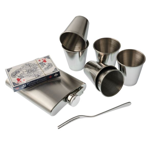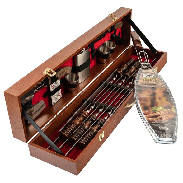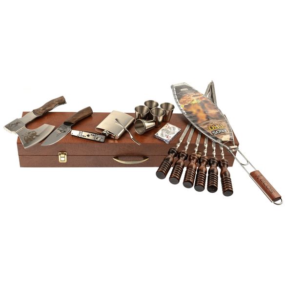 Этот подарочный набор для шашлыка и барбекю - идеальный выбор для тех, кто любит готовить на гриле.Набор включает в себя все необходимое для идеального барбекю: от шампуров и решетки-гриль до практичного топорика и острого ножа. В дополнение к основному оборудованию, в комплекте идут металлические рюмки, колода карт и фляга - приятные дополнения, расширяющие возможные виды деятельности на природе.