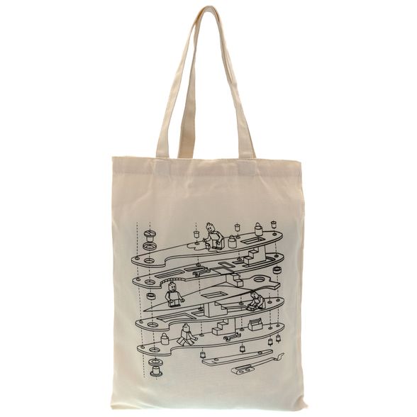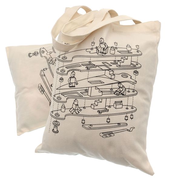 На сумке - разбор того самого складного помощника по деталям и смешные лего-человечки, которые его собирают. Получается иронично и узнаваемо: любители механики поймут, остальные улыбнутся.