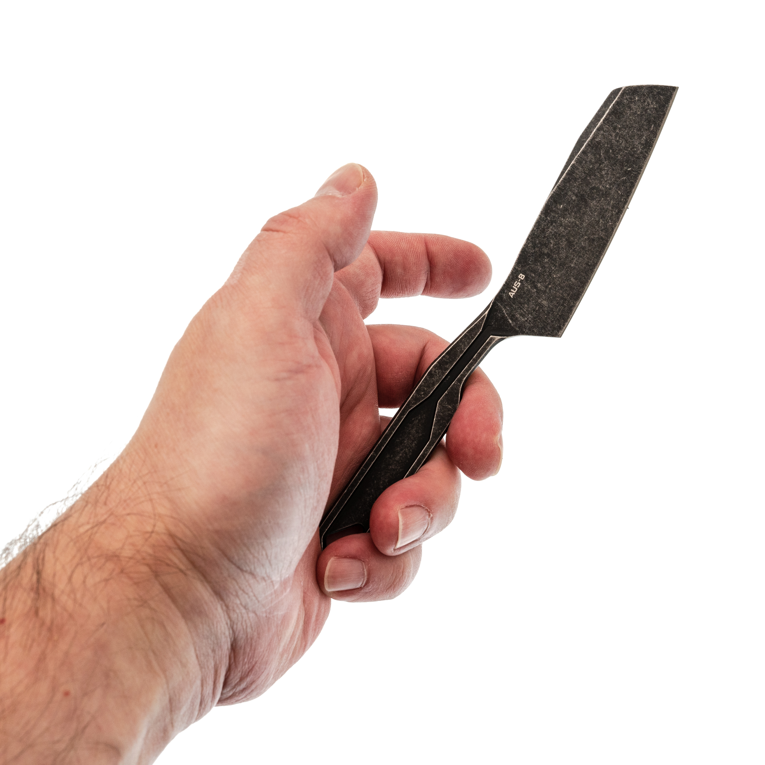 - AUS-8: Хороший выбор для каждодневной носки. Эта сталь не требует трепетного ухода, прощает контакт с влагой и долго остается острой. Если нож и затупится, привести его в чувство можно обычной мусатой или камнем.