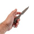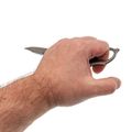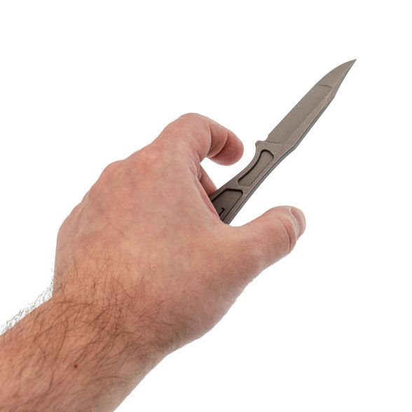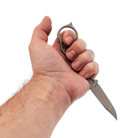 Поскольку нож выполнен по скелетной схеме, рукоять не имеет накладок. В ладони ощущается плоский стальной хвостовик. Для длительных и грубых работ, требующих мозолей, это не самый удобный вариант. Но для своего класса - быстрого доступа и выполнения конкретных коротких задач - эргономики хватает. Большое отверстие в торце выполняет двойную функцию: оно облегчает конструкцию и служит для подхвата пальцем при резком извлечении ножа из-под снаряжения.