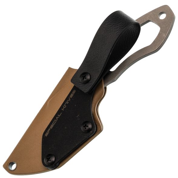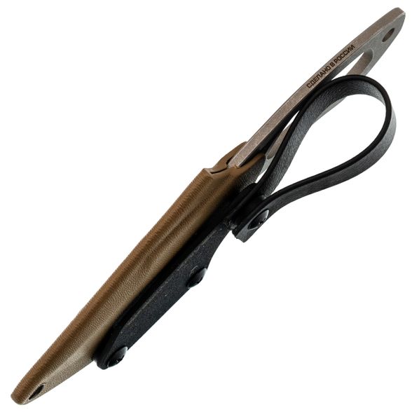 Ножны держат нож с ощутимым усилием, исключая люфт. Люверсы по периметру дают свободу в выборе расположения на снаряжении - можно закрепить горизонтально, вертикально или наклонно. В комплекте идет переходник с силиконовой петлей для фиксации на ремень. Это максимально ненавязчивый способ ношения: петля охватывает ремень, ножны цепляются за пластину, и вся конструкция не съезжает и не переворачивается при движениях.