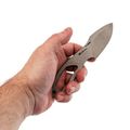 Клинок формы Drop-Point с высокими спусками - универсальный солдат. Здесь нет ничего лишнего: режущая кромка начинается сразу от пяты и тянется до самого кончика. Прямые спуски снижают усилие при резе, а выраженный кончик позволяет делать точечные работы - например, снять заусенец или проткнуть плотную упаковку без риска сломать острие. Финиш Stonewash - матовый, равномерный, без лишнего блеска. На таком покрытии не видно патины и мелких царапин от работы.